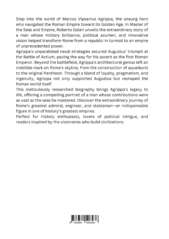 Step into the world of Marcus Vipsanius Agrippa, the unsung hero who navigated the Roman Empire toward its Golden Age. In Master of the Seas and Empire, Roberto Galen unveils the extraordinary story of a man whose military brilliance, political acumen, and innovative vision helped transform Rome from a republic in turmoil to an empire of unprecedented power.Agrippa's unparalleled naval strategies secured Augustus' triumph at the Battle of Actium, paving the way for his ascent as the first Roman Emperor. Beyond the battlefield, Agrippa's architectural genius left an indelible mark on Rome's skyline, from the construction of aqueducts to the original Pantheon. Through a blend of loyalty, pragmatism, and ingenuity, Agrippa not only supported Augustus but reshaped the Roman world itself.This meticulously researched biography brings Agrippa's legacy to life, offering a compelling portrait of a man whose contributions were as vast as the seas he mastered. Discover the extraordinary journey of Rome's greatest admiral, engineer, and statesmanan indispensable figure in one of history's greatest empires.Perfect for history enthusiasts, lovers of political intrigue, and readers inspired by the visionaries who build civilizations.