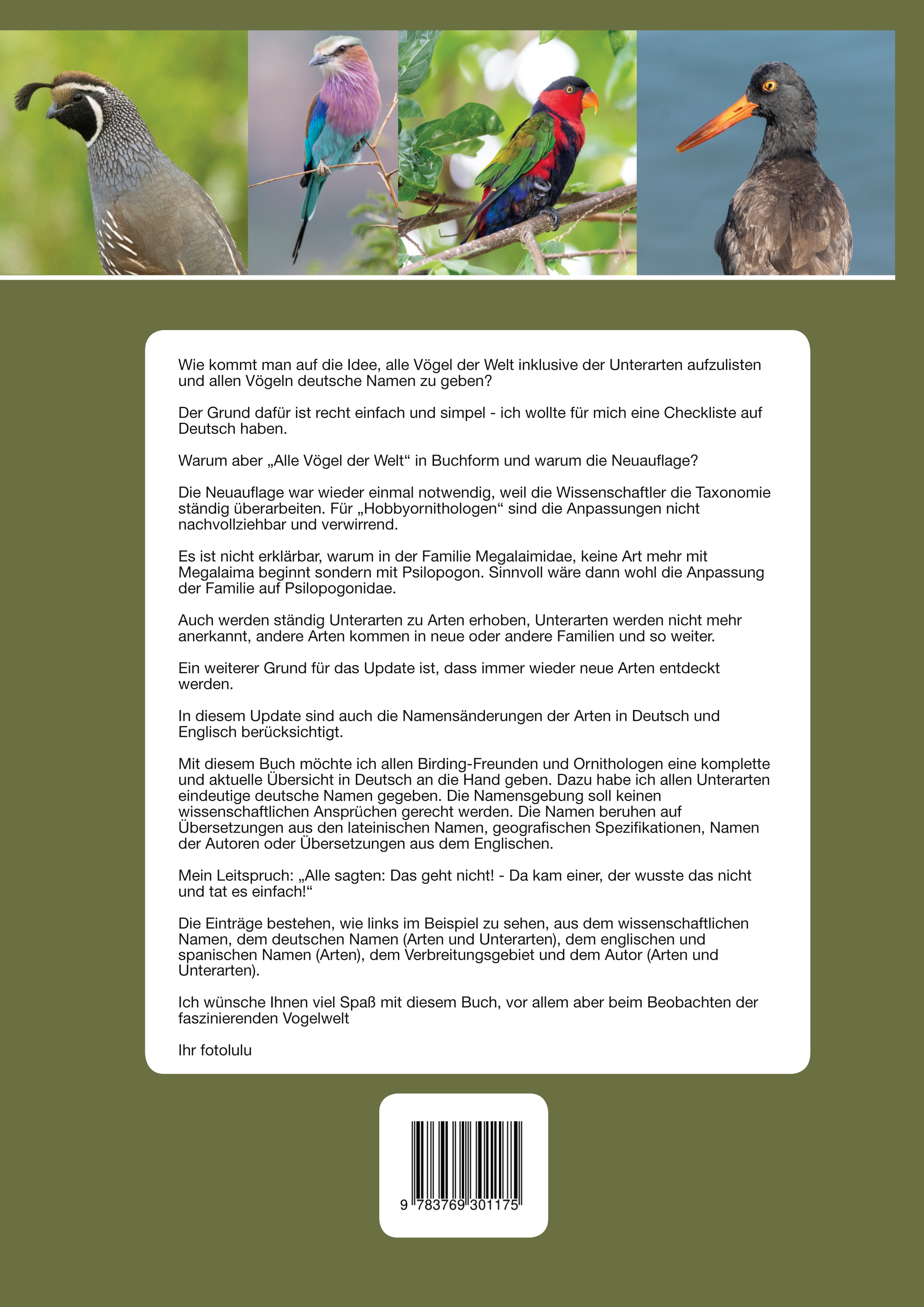 Mit diesem Buch möchte ich allen Birding-Freunden und Ornithologen eine komplette und aktuelle Übersicht in Deutsch an die Hand geben. Dazu habe ich allen Unterarten eindeutige deutsche Namen gegeben. Die Namensgebung soll keinen wissenschaftlichen Ansprüchen gerecht werden. Die Namen beruhen auf Übersetzungen aus den lateinischen Namen, geografischen Spezifikationen, Namen der Autoren oder Übersetzungen aus dem Englischen.