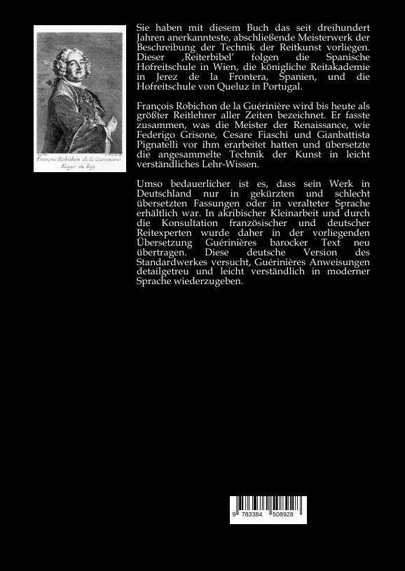 Sie haben mit diesem Buch das seit dreihundert Jahren anerkannteste, abschließende Meisterwerk der Beschreibung der Technik der Reitkunst vorliegen. Dieser Reiterbibel' folgen die Spanische Hofreitschule in Wien, die königliche Reitakademie in Jerez de la Frontera, Spanien, und die Hofreitschule von Queluz in Portugal.François Robichon de la Guérinière wird bis heute als größter Reitlehrer aller Zeiten bezeichnet. Er fasste zusammen, was die Meister der Renaissance, wie Federigo Grisone, Cesare Fiaschi und Gianbattista Pignatelli vor ihm erarbeitet hatten und übersetzte die angesammelte Technik der Kunst in leicht verständliches akademisches Lehr-Wissen.