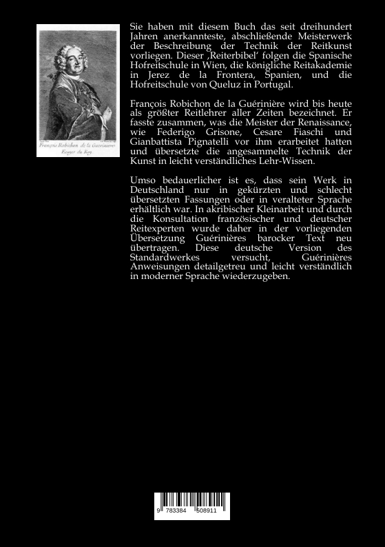 Sie haben mit diesem Buch das seit dreihundert Jahren anerkannteste, abschließende Meisterwerk der Beschreibung der Technik der Reitkunst vorliegen. Dieser Reiterbibel' folgen die Spanische Hofreitschule in Wien, die königliche Reitakademie in Jerez de la Frontera, Spanien, und die Hofreitschule von Queluz in Portugal.François Robichon de la Guérinière wird bis heute als größter Reitlehrer aller Zeiten bezeichnet. Er fasste zusammen, was die Meister der Renaissance, wie Federigo Grisone, Cesare Fiaschi und Gianbattista Pignatelli vor ihm erarbeitet hatten und übersetzte die angesammelte Technik der Kunst in leicht verständliches akademisches Lehr-Wissen.