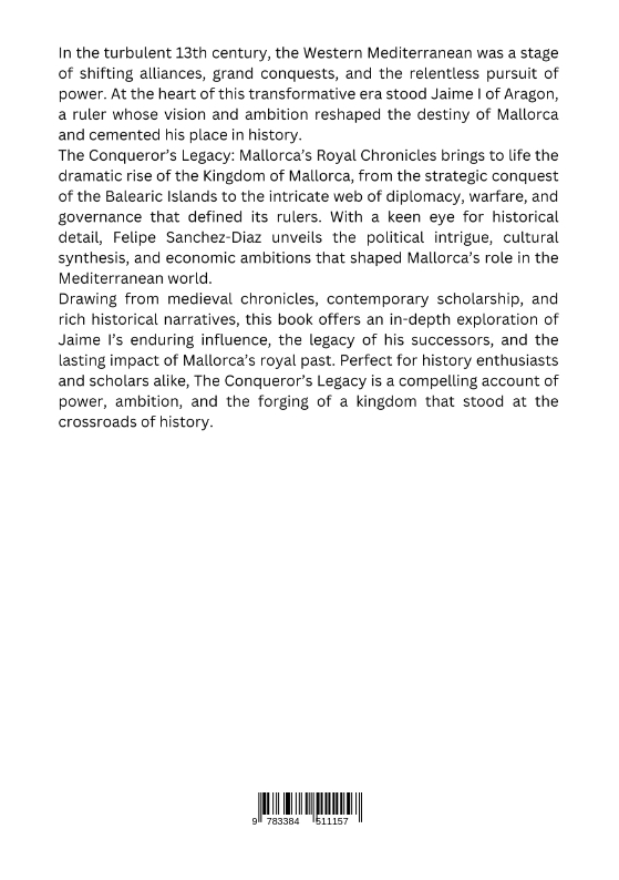 In the turbulent 13th century, the Western Mediterranean was a stage of shifting alliances, grand conquests, and the relentless pursuit of power. At the heart of this transformative era stood Jaime I of Aragon, a ruler whose vision and ambition reshaped the destiny of Mallorca and cemented his place in history.The Conqueror's Legacy: Mallorca's Royal Chronicles brings to life the dramatic rise of the Kingdom of Mallorca, from the strategic conquest of the Balearic Islands to the intri-cate web of diplomacy, warfare, and governance that defined its rulers. With a keen eye for historical detail, Felipe Sanchez-Diaz unveils the political intrigue, cultural synthesis, and economic ambitions that shaped Mallorca's role in the Mediterranean world.Drawing from medieval chronicles, contemporary scholarship, and rich historical narra-tives, this book offers an indepth exploration of Jaime I's enduring influence, the legacy of his successors, and the lasting impact of Mallorca's royal past. Perfect for history enthusiasts and scholars alike, The Conqueror's Legacy is a compelling account of power, ambition, and the forging of a kingdom that stood at the crossroads of history.