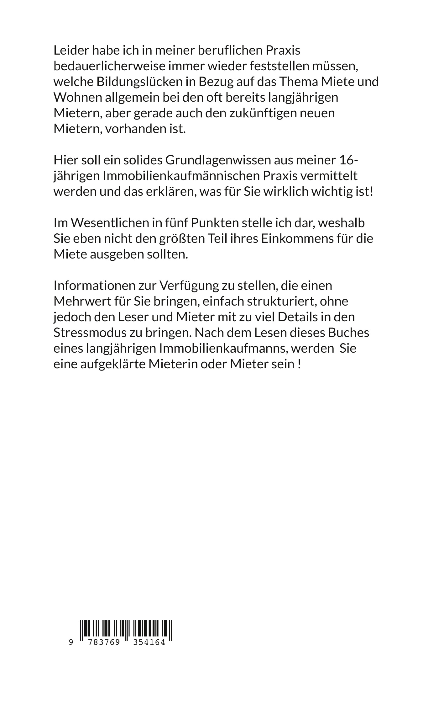 Informationen zur Verfügung zu stellen, die einen Mehrwert für Sie bringen, einfach strukturiert, ohne jedoch den Leser und Mieter mit zu viel Details in den Stressmodus zu bringen. Nach dem Lesen dieses Insiderwissens eines langjährigen Immobilienkaufmanns werden Sie eines sein: Eine aufgeklärte Mieterin oder Mieter. Dieses Versprechen gebe ich Ihnen!