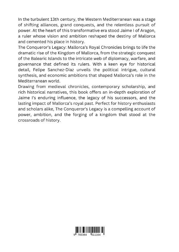 In the turbulent 13th century, the Western Mediterranean was a stage of shifting alliances, grand conquests, and the relentless pursuit of power. At the heart of this transformative era stood Jaime I of Aragon, a ruler whose vision and ambition reshaped the destiny of Mallorca and cemented his place in history.The Conqueror's Legacy: Mallorca's Royal Chronicles brings to life the dramatic rise of the Kingdom of Mallorca, from the strategic conquest of the Balearic Islands to the intri-cate web of diplomacy, warfare, and governance that defined its rulers. With a keen eye for historical detail, Felipe Sanchez-Diaz unveils the political intrigue, cultural synthesis, and economic ambitions that shaped Mallorca's role in the Mediterranean world.Drawing from medieval chronicles, contemporary scholarship, and rich historical narra-tives, this book offers an indepth exploration of Jaime I's enduring influence, the legacy of his successors, and the lasting impact of Mallorca's royal past. Perfect for history enthusiasts and scholars alike, The Conqueror's Legacy is a compelling account of power, ambition, and the forging of a kingdom that stood at the crossroads of history.