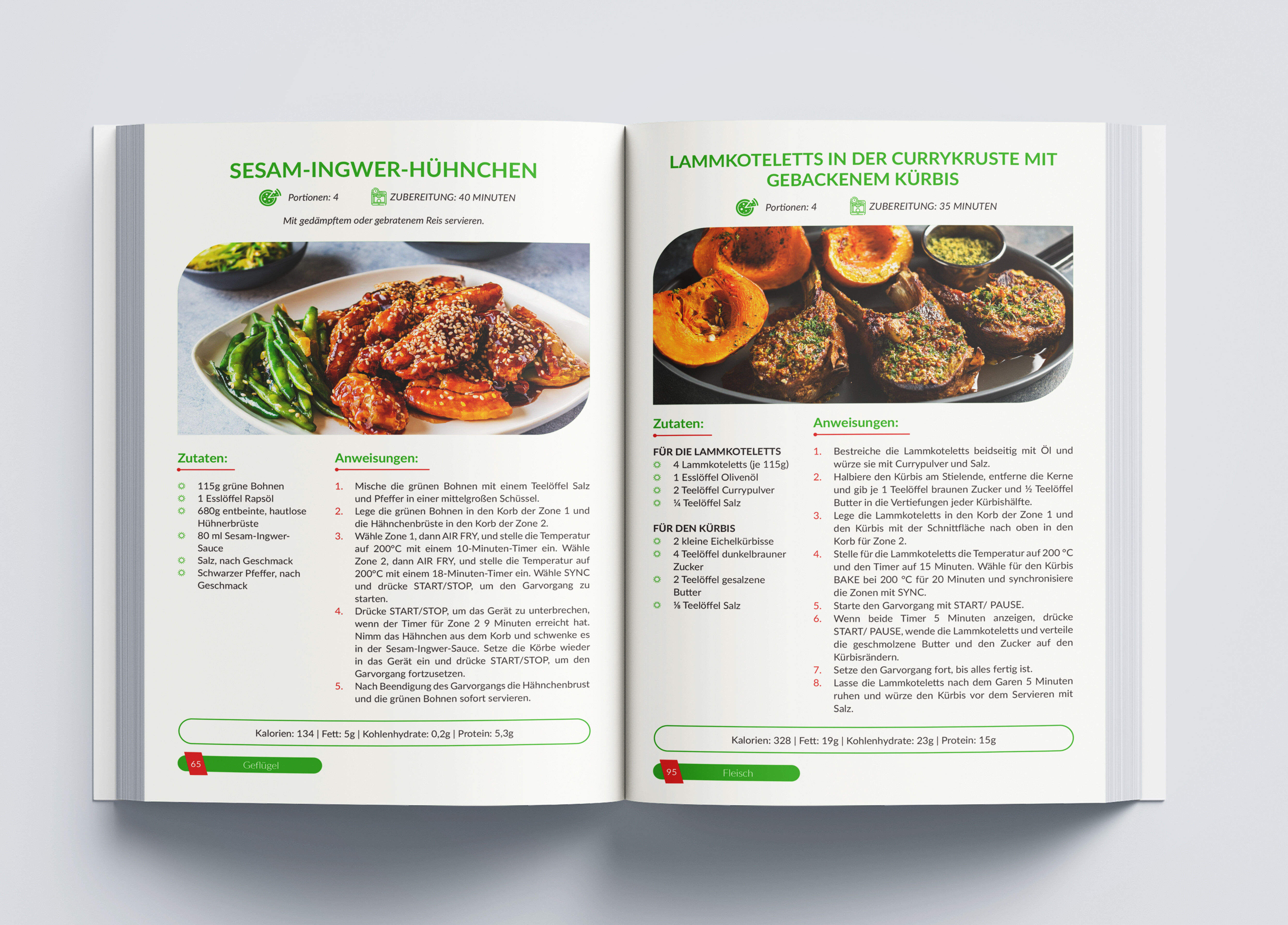 - Vielfältige Rezepte: Von Snacks und Beilagen bis hin zu Hauptgerichten - entdecke eine breite Auswahl an Gerichten, die speziell für die Ninja Dual Zone Heißluftfritteuse entwickelt wurden.