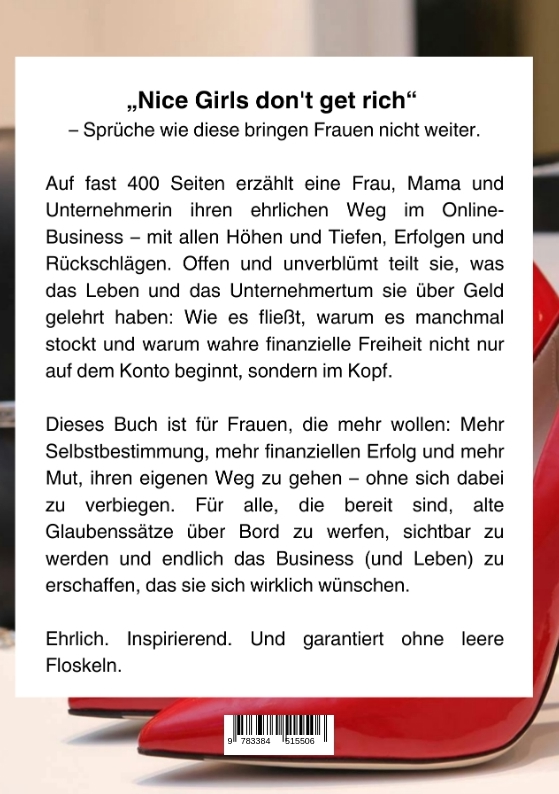 "Nice Girls don't get rich" - Sprüche wie diese bringen Frauen nicht weiter.Auf fast 400 Seiten erzählt eine Frau, Mama und Unternehmerin ihren ehrlichen Weg im Online-Business - mit allen Höhen und Tiefen, Erfolgen und Rückschlägen. Offen und unverblümt teilt sie, was das Leben und das Unternehmertum sie über Geld gelehrt haben: Wie es fließt, warum es manchmal stockt und warum wahre finanzielle Freiheit nicht nur auf dem Konto beginnt, sondern im Kopf.Dieses Buch ist für Frauen, die mehr wollen: Mehr Selbstbestimmung, mehr finanziellen Erfolg und mehr Mut, ihren eigenen Weg zu gehen - ohne sich dabei zu verbiegen. Für alle, die bereit sind, alte Glaubenssätze über Bord zu werfen, sichtbar zu werden und endlich das Business (und Leben) zu erschaffen, das sie sich wirklich wünschen.Ehrlich. Inspirierend. Und garantiert ohne leere Floskeln.