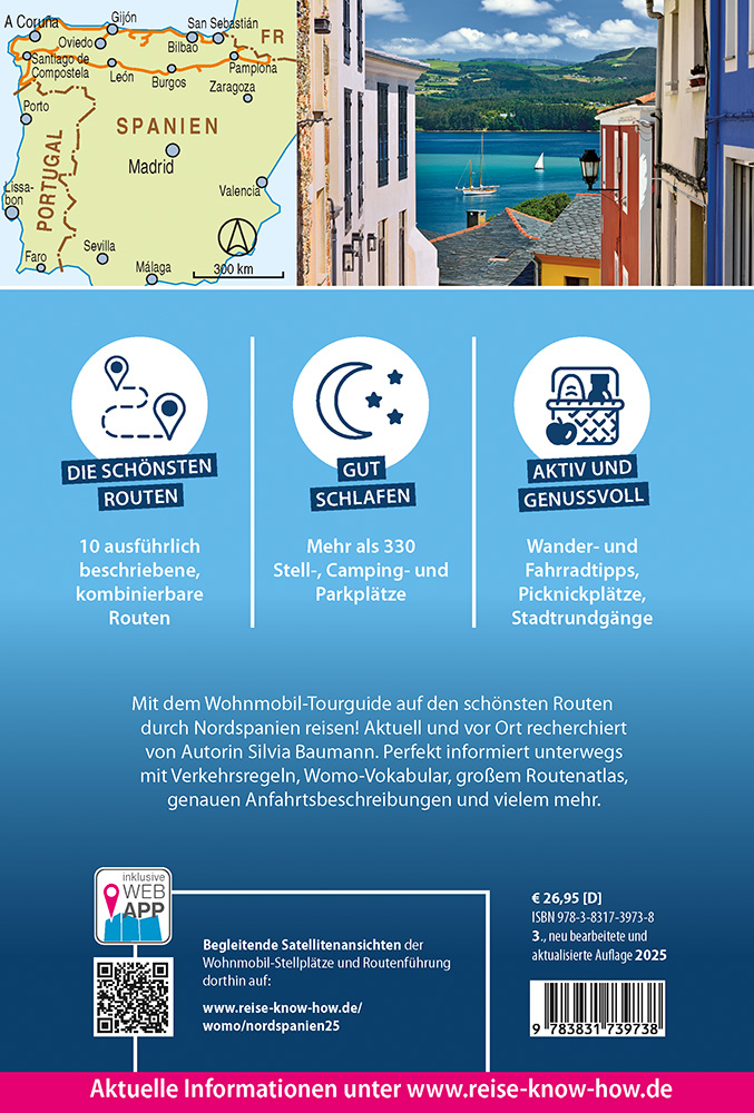 Ob passionierter Wohnmobilist oder Neueinsteiger, ob junge Familie oder Senior: Mit diesem Buch findet jeder sein Urlaubsparadies. Zehn miteinander verbundene Routen folgen der nordspanischen Küste vom Baskenland durch Kantabrien und Asturien bis nach Galicien, inklusive erlebnisreicher Abstecher in die Berge. Drei der Routen begleiten den legendären Jakobsweg mit den für Wohnmobilreisende geeigneten, gut erreichbaren Zielen in Aragonien, Navarra, La Rioja und Kastilien-León bis nach Fisterra. Auch die reizvollsten Städte Nordspaniens stehen auf dem Programm, darunter San Sebastián, Bilbao, Santander, A Coruña, Pamplona, Burgos, León und Santiago de Compostela.