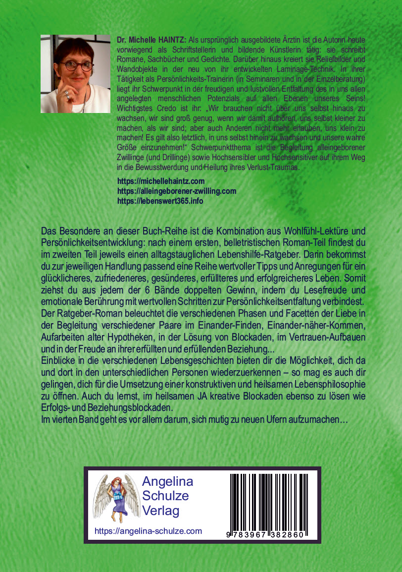 Gönne dir auch den 4. Teil dieses 6-bändigen Ratgeber-Romanes und erlebe doppelten Gewinn, indem du Lesefreude und emotionale Berührung mit wertvollen Schritten zur Persönlichkeitsentfaltung verbindest.