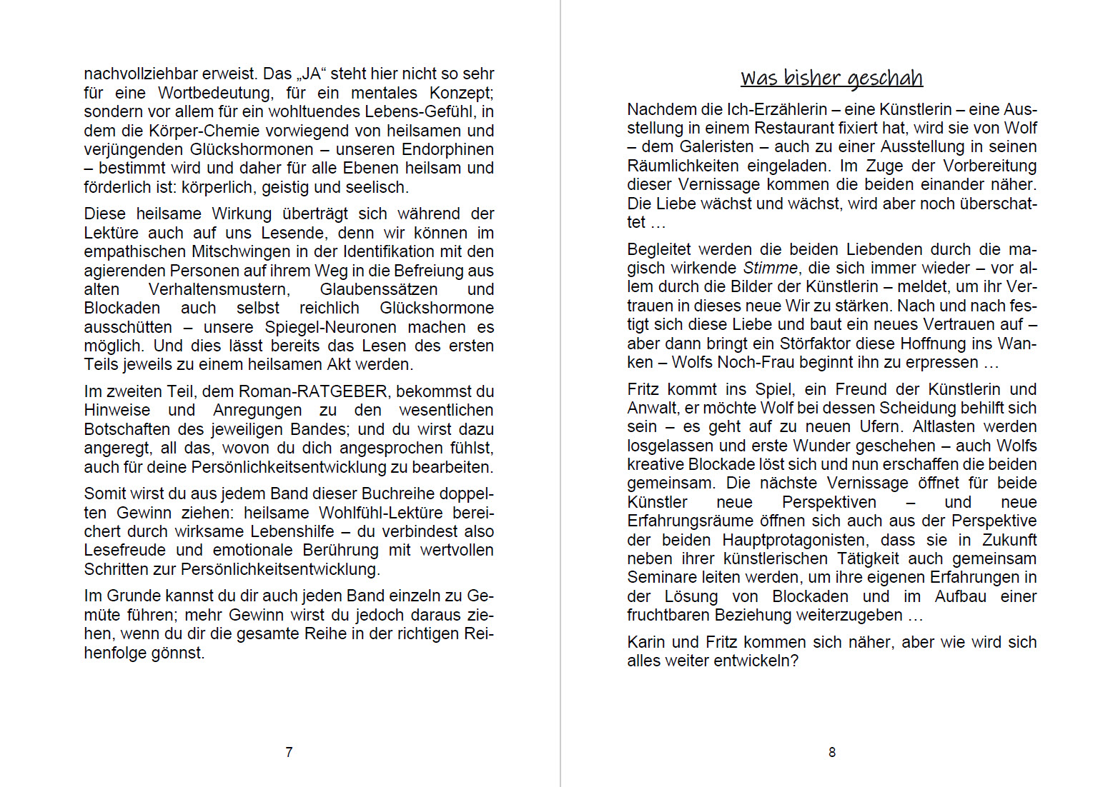 Nach einem ersten, belletristischen Roman-Teil findest du im zweiten Teil jeweils einen alltagstauglichen Lebenshilfe-Ratgeber. Darin bekommst du zur jeweiligen Handlung passend eine Reihe wertvoller Tipps und Anregungen für ein glücklicheres, zufriedeneres, gesünderes, erfüllteres und erfolgreicheres Leben.