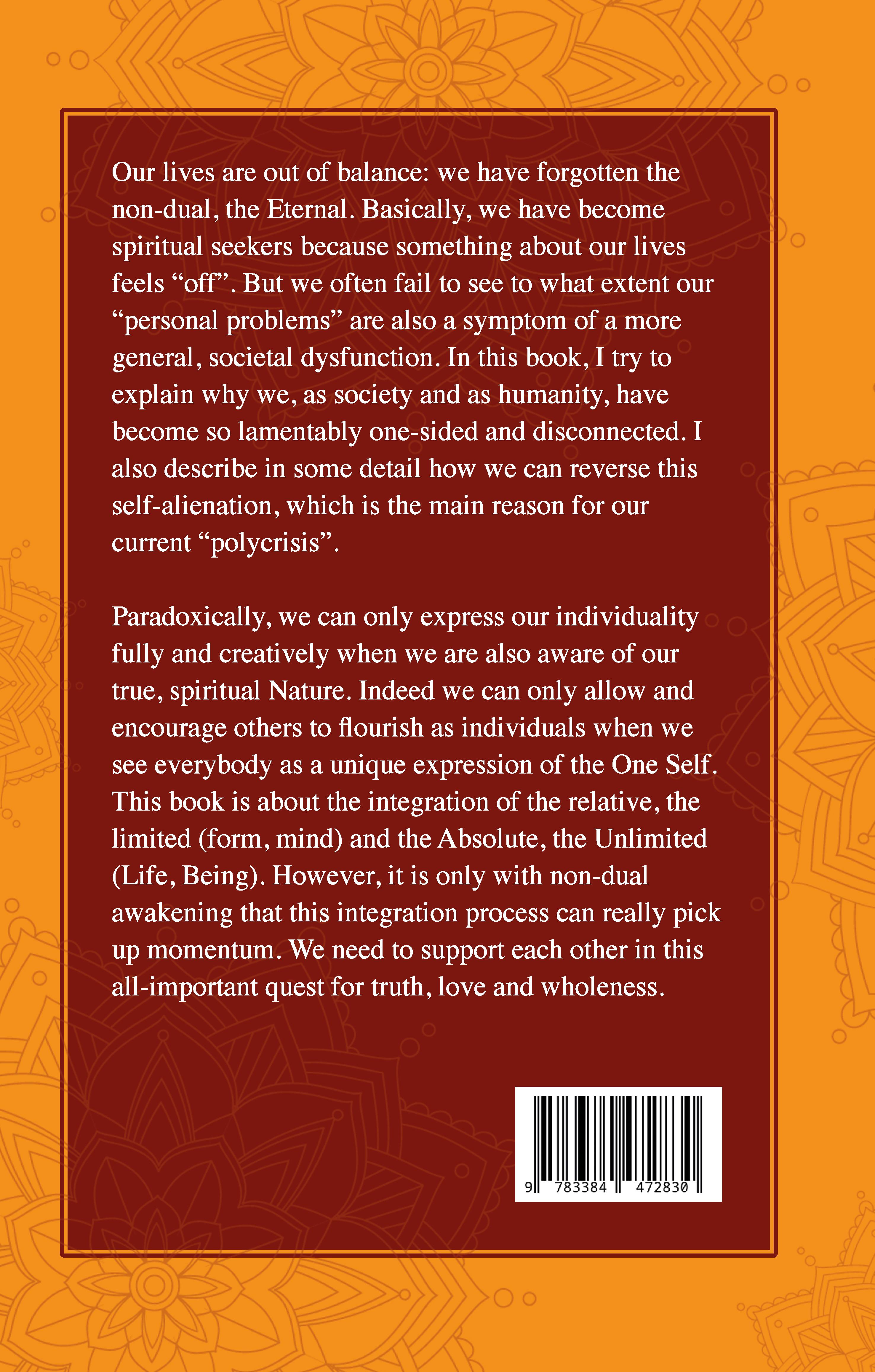 Our lives are out of balance: we have forgotten the non-dual, the Eternal. Basically, we have become spiritual seekers because something about our lives feels "off". But we often fail to see to what extent our "personal problems" are also a symptom of a more general, societal dysfunction. In this book, I try to explain why we, as society and as humanity, have become so lamentably one-sided and disconnected. I also describe in some detail how we can reverse this self-alienation, which is the main reason for our current "polycrisis".Paradoxically, we can only express our individuality fully and creatively when we are also aware of our true, spiritual Nature. Indeed we can only allow and encourage others to flourish as individuals when we see everybody as a unique expression of the One Self. This book is about the integration of the relative, the limited (form, mind) and the Absolute, the Unlimited (Life, Being). However, it is only with non-dual awakening that this integration process can really pick up momentum. We need to support each other in this all-important quest for truth, love and wholeness. // Table of Contents: Integration: the Way of Mastery // The personal and the Divine // Discovering your true Self // Beyond identity and the person // The ego and you // Giving up brings harmony and equilibrium // Divine Presence and personal story // The spiritual meaning of your personal destiny // Your cross is the world´s cross // The bigger picture // Meditation and self-inquiry // You are not the mind // Meditation, distraction and depression // Your freedom // Be who you are, allow everything // Investigating reality // There is no hope for the ego // The desire for truth alone // I AM // Spiritual skills and pitfalls // Attention and intention // Noticing transparency and formlessness // Suffering and happiness // Why healing and "fixing" can be traps // The physical body and the energy body // Restoring balance // Be realistic and believe in miracles // Spiritual frequencies // Reclaiming our lost humanity // Brain lateralization and reductionism // A comprehensive humanist view of intelligence // Mental health, connectedness and society // Our relation with nature and with work // Bibliography
