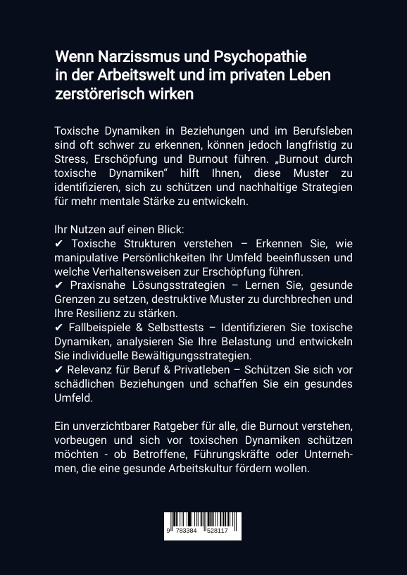 | Schlagworte | Achtsamkeit • Burnout • Lebensbalance • Narzissmus • Persönlichkeitsentwicklung • Psychopathie • Resilienz • Selbstreflexion • Stressmanagement • Teamdynamik • Toxische Dynamiken • Unternehmenskultur |