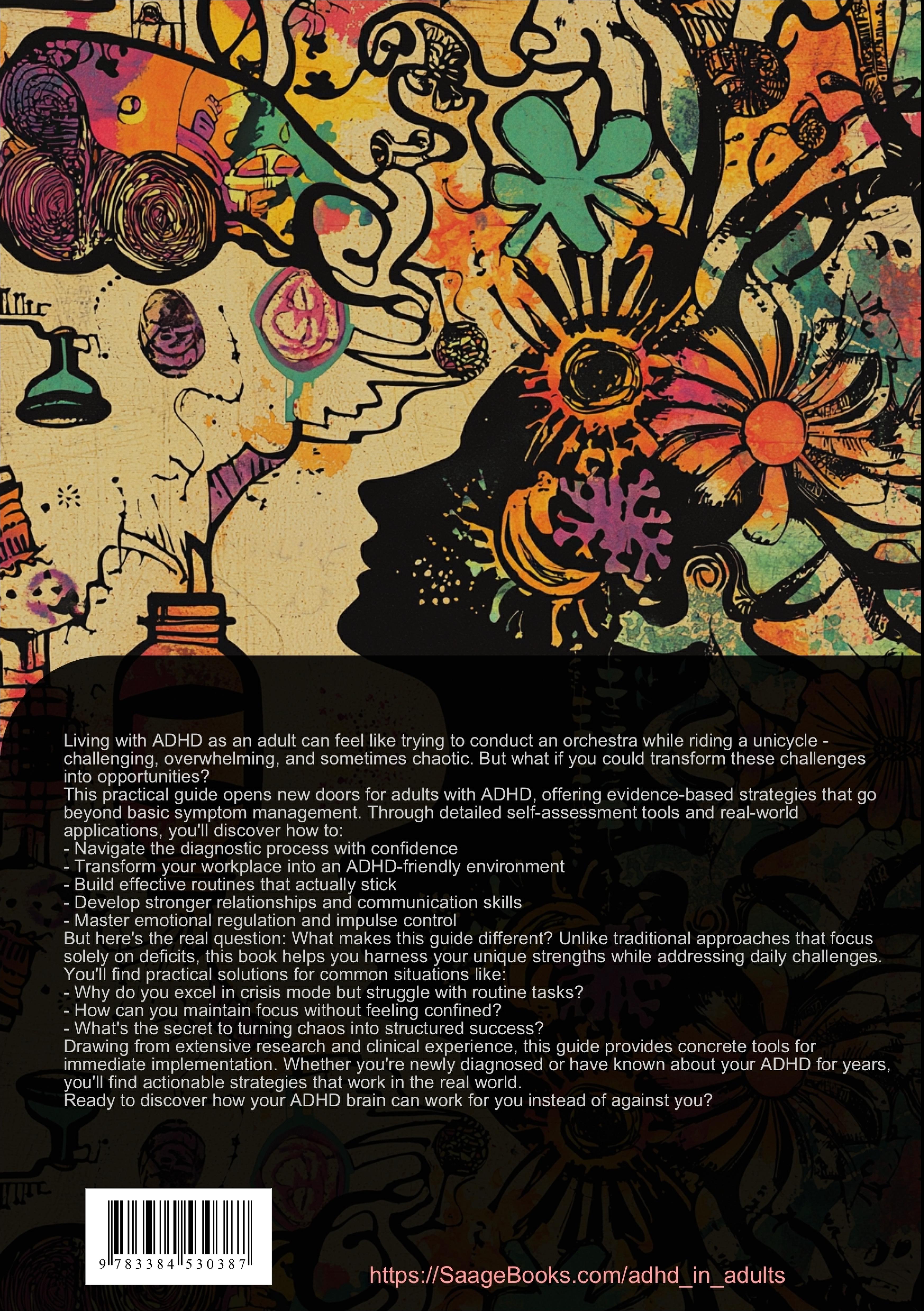 This comprehensive ADHD guide provides adults with practical strategies for managing attention deficit hyperactivity disorder in daily life and professional settings.The book begins with detailed information about ADHD in adults, including reliable self-test methods to help answer the question 'Do I have ADHD?' Readers will learn about the specific manifestations of adult ADHD and ADD, and how these conditions differ from childhood presentations.A significant portion focuses on ADHD at work, offering concrete tools for career success with ADHD. Topics include workplace accommodations, communication strategies with supervisors and colleagues, and methods for optimizing performance in professional environments.The therapy tools section presents various treatment approaches for ADHD in adulthood, including:- Behavioral therapy techniques- Medication management- Stress reduction strategies- Organization systems- Time management methodsPractical chapters on daily organization address common challenges faced by adults with ADHD, providing structured approaches for:- Household management- Financial planning- Relationship maintenance- Schedule coordinationThe book emphasizes evidence-based ADHD therapy for adults while acknowledging individual differences in symptom presentation and treatment response. Readers will find actionable strategies for:- Improving focus and concentration- Managing impulsivity- Developing effective routines- Building sustainable organizational systemsWhether newly diagnosed or long aware of their ADHD, readers will discover practical tools to support their journey toward successful management of adult ADHD/ADD in both personal and professional contexts.This book was created using innovative technologies such as Artificial Intelligence and specially developed tools - for example, in brainstorming, research, writing, editing, quality assurance, and the design of decorative illustrations.In this way, we want to offer you a particularly coherent, modern, and even higher-quality reading experience.