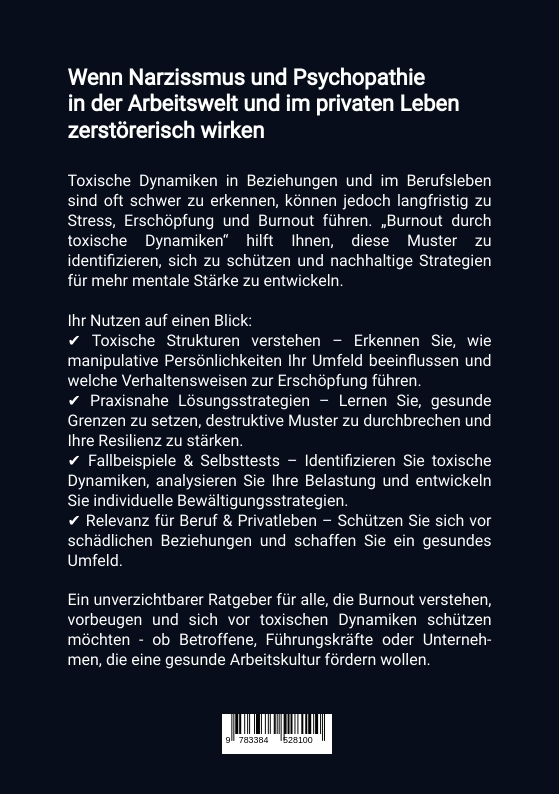 | Schlagworte | Achtsamkeit • Burnout • Lebensbalance • Narzissmus • Persönlichkeitsentwicklung • Psychopathie • Resilienz • Selbstreflexion • Stressmanagement • Teamdynamik • Toxische Dynamiken • Unternehmenskultur |