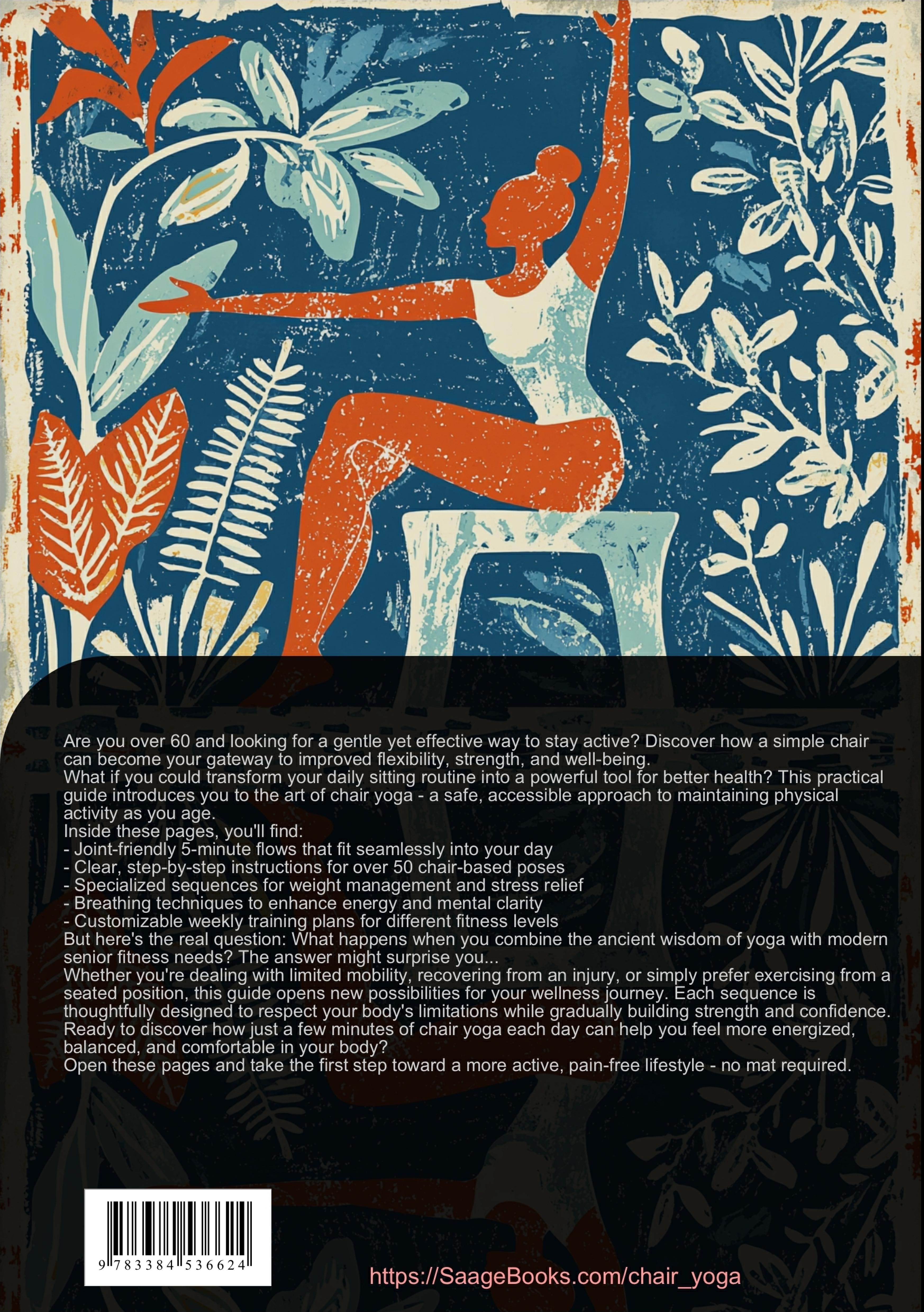 Discover the gentle and effective practice of Chair Yoga specifically designed for seniors over 60. This practical guide introduces joint-friendly yoga flows and asanas that can be performed safely and comfortably while seated.The book offers a comprehensive approach to chair yoga, featuring:- Easy-to-follow 5-minute chair yoga sequences for daily practice- Joint-friendly movements that promote flexibility and strength- Specialized weight loss exercises adapted for seated practice- Detailed training plans for home practiceLearn how to:- Improve mobility and balance through gentle movements- Reduce stress and anxiety with seated breathing techniques- Build strength and flexibility without straining your joints- Maintain an active lifestyle from the comfort of your chairThis guide includes:- Clear instructions for proper alignment and technique- Modified versions of traditional yoga poses- Progressive sequences for different fitness levels- Safe practices for those with limited mobilityWhether you're new to yoga or looking for a more accessible approach, this chair yoga guide provides:- Morning energizing sequences- Midday stress-relief practices- Evening relaxation flows- Targeted exercises for specific areas of the bodyThe book emphasizes:- Safety-first approach to yoga practice- Adaptable exercises for various mobility levels- Practical tips for creating a comfortable practice space- Regular training plans to establish a consistent routineStart your journey to improved well-being with chair yoga - a gentle, effective way to maintain physical activity and mental clarity in your golden years.This book was created using innovative technologies such as Artificial Intelligence and specially developed tools - for example, in brainstorming, research, writing, editing, quality assurance, and the design of decorative illustrations.In this way, we want to offer you a particularly coherent, modern, and even higher-quality reading experience.