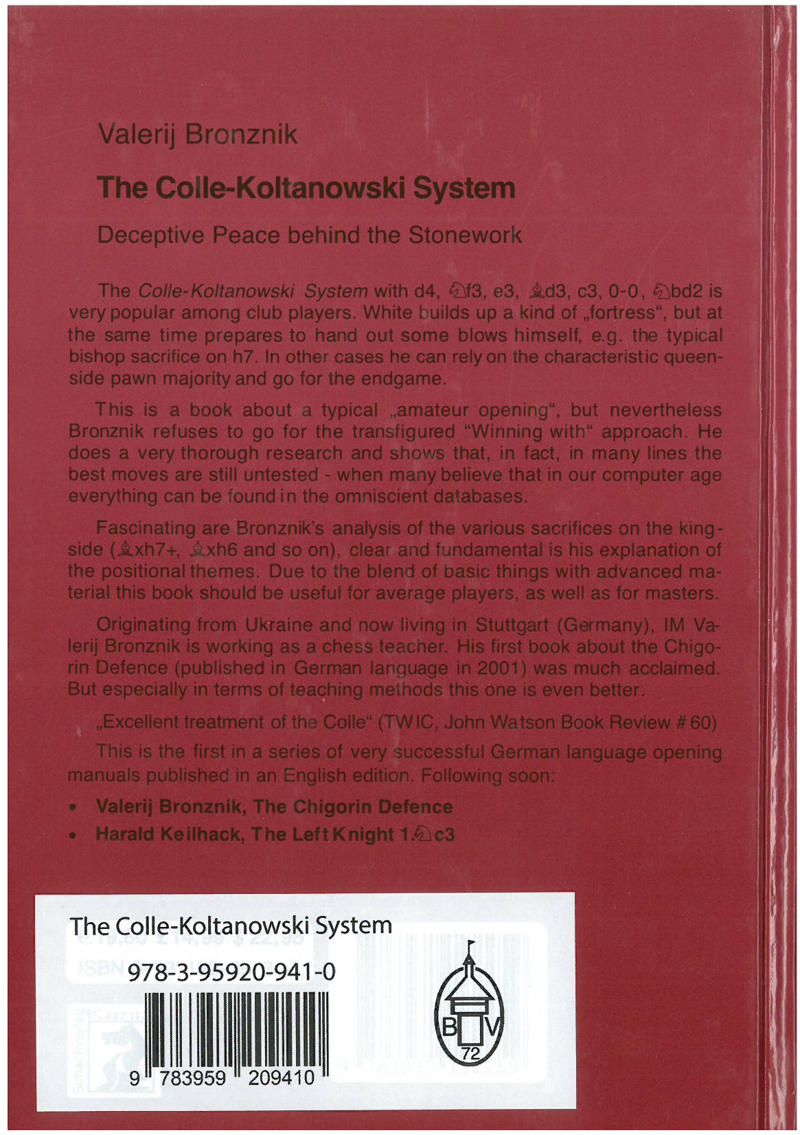 The Colle-Koltanowski system with d4, Nf3, e3, Bd3, c3, 0-0, Nbd2 is very popular among club players. White builds up a kind of "fortress", but at the same tim prepares to hand out some blows himself, e.g. the typical bishop sacrifice on h7. In other cases he can rely on the characteristic queen-pawn majority and go for the endgame.Even though it is a typical "amateur opening", Bronznik stands out pleasantly from the romanticized style of the "Win with" books. In every position he gets to the bottom of things and demonstrates that in many variations the best moves are still untested - when many beliefe that in our computer age everything can bei found in the omniscient databases.The analyses of various sacrifice games on the kingside are fascinating, and the explanations of positional topics are fundamental and clear. The interplay of more elementary things with more demanding content should ensure that all skill levels get their money's worth.