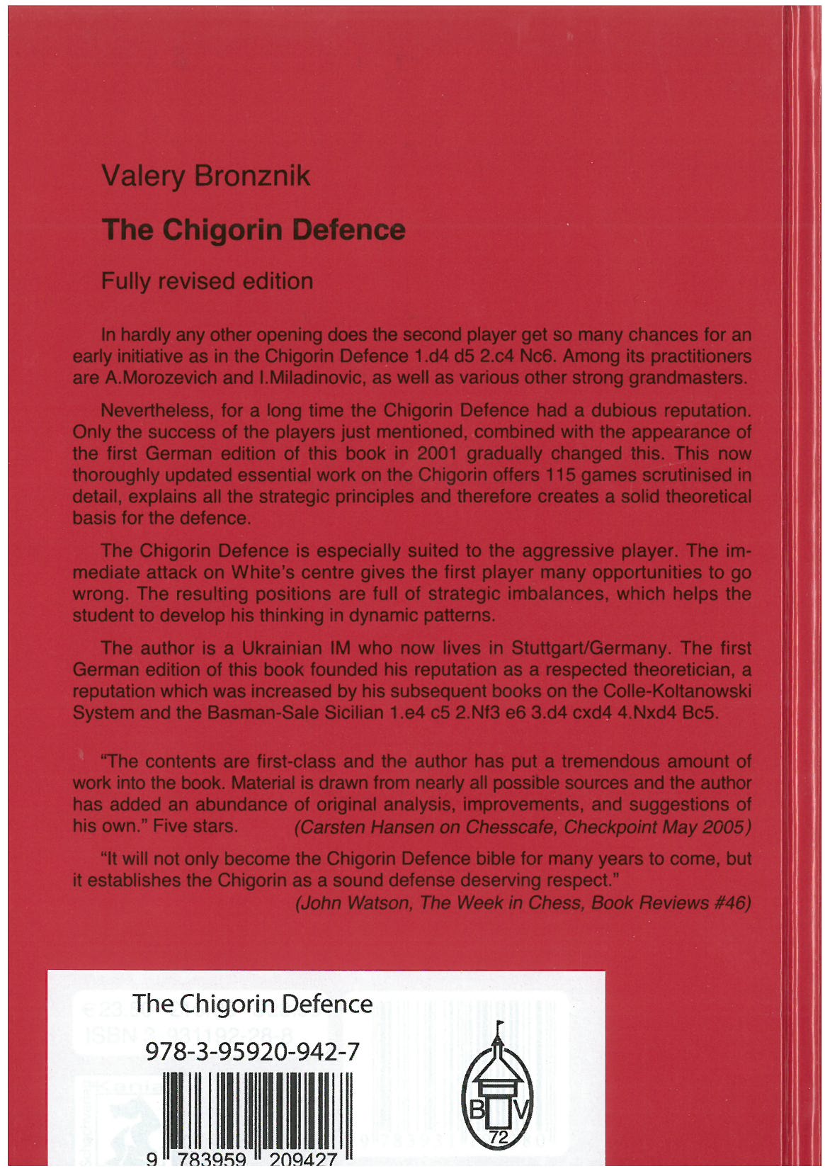 In hardly any other opening does the second player get so many chances for an early initiative as in the Chigorin Defence 1.d4 d5 2.c4 Nc6. Among its practitioners are A.Morozevich and I.Miladinovic, as well as various other strong grandmasters.Nevertheless, for a long time the Chigorin Defence had a dubious reputation. Only the success of the players just mentioned, combined with the appearance of the first German edition of this book in 2001 gradually changed this. This now thoroughly updated essential work on the Chigorin offers 115 games scrutinised in detail, explains all the strategic principles and therefore creates a solid theoretical basis for the defence.The Chigorin Defence is especially suited to the aggressive player. The immediate attack on White's centre gives the first player many opportunities to go wrong. The resulting positions are full of strategic imbalances, which helps the student to develop his thinking in dynamic patterns.