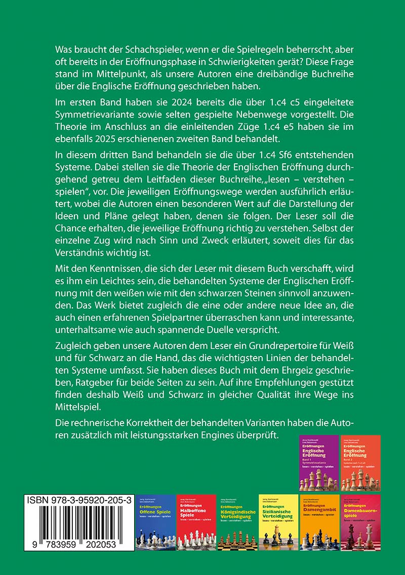 Was braucht der Schachspieler, wenn er die Spielregeln beherrscht, aber oft bereits in der Eröffnungsphase in Schwierigkeiten gerät? Diese Frage stand im Mittelpunkt, als unsere Autoren eine dreibändige Buchreihe über die Englische Eröffnung geschrieben haben.Im ersten Band haben sie 2024 bereits die über 1.c4 c5 eingeleitete Symmetrievariante sowie selten gespielte Nebenwege vorgestellt. Die Theorie im Anschluss an die einleitenden Züge 1.c4 e5 haben sie im ebenfalls 2025 erschienenen zweiten Band behandelt.In diesem dritten Band behandeln sie die über 1.c4 Sf6 entstehenden Systeme. Dabei stellen sie die Theorie der Englischen Eröffnung durchgehend getreu dem Leitfaden dieser Buchreihe, "lesen - verstehen - spielen", vor. Die jeweiligen Eröffnungswege werden ausführlich erläutert, wobei die Autoren einen besonderen Wert auf die Darstellung der Ideen und Pläne gelegt haben, denen sie folgen. Der Leser soll die Chance erhalten, die jeweilige Eröffnung richtig zu verstehen. Selbst der einzelne Zug wird nach Sinn und Zweck erläutert, soweit dies für das Verständnis wichtig ist.Mit den Kenntnissen, die sich der Leser mit diesem Buch verschafft, wird es ihm ein Leichtes sein, die behandelten Systeme der Englischen Eröffnung mit den weißen wie mit den schwarzen Steinen sinnvoll anzuwenden. Das Werk bietet zugleich die eine oder andere neue Idee an, die auch einen erfahrenen Spielpartner überraschen kann und interessante, unterhaltsame wie auch spannende Duelle verspricht.Zugleich geben unsere Autoren dem Leser ein Grundrepertoire für Weiß und für Schwarz an die Hand, das die wichtigsten Linien der behandelten Systeme umfasst. Sie haben dieses Buch mit dem Ehrgeiz geschrieben, Ratgeber für beide Seiten zu sein. Auf ihre Empfehlungen gestützt finden deshalb Weiß und Schwarz in gleicher Qualität ihre Wege ins Mittelspiel.Die rechnerische Korrektheit der behandelten Varianten haben die Autoren zusätzlich mit leistungsstarken Engines überprüft.