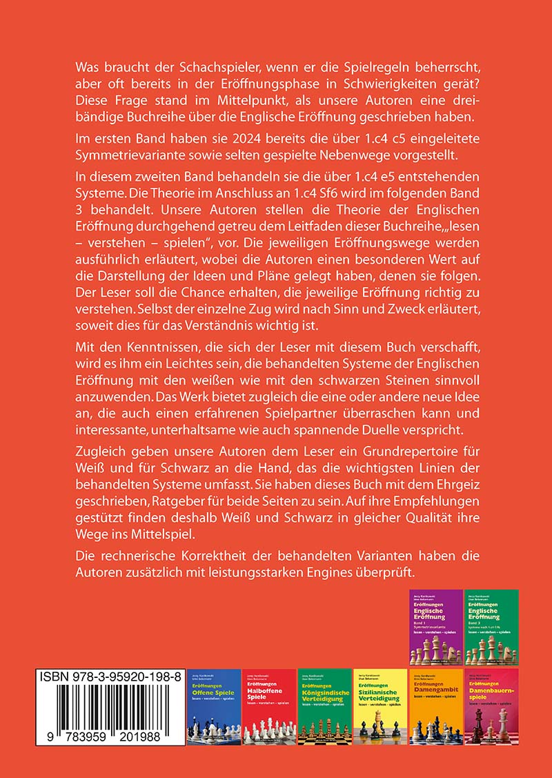 Was braucht der Schachspieler, wenn er die Spielregeln beherrscht, aber oft bereits in der Eröffnungsphase in Schwierigkeiten gerät? Diese Frage stand im Mittelpunkt, als unsere Autoren eine dreibändige Buchreihe über die Englische Eröffnung geschrieben haben.Im ersten Band haben sie 2024 bereits die über 1.c4 c5 eingeleitete Symmetrievariante sowie selten gespielte Nebenwege vorgestellt.In diesem zweiten Band behandeln sie die über 1.c4 e5 entstehenden Systeme. Die Theorie im Anschluss an 1.c4 Sf6 wird im folgenden Band 3 behandelt. Unsere Autoren stellen die Theorie der Englischen Eröffnung durchgehend getreu dem Leitfaden dieser Buchreihe, "lesen - verstehen - spielen", vor. Die jeweiligen Eröffnungswege werden ausführlich erläutert, wobei die Autoren einen besonderen Wert auf die Darstellung der Ideen und Pläne gelegt haben, denen sie folgen. Der Leser soll die Chance erhalten, die jeweilige Eröffnung richtig zu verstehen. Selbst der einzelne Zug wird nach Sinn und Zweck erläutert, soweit dies für das Verständnis wichtig ist.Mit den Kenntnissen, die sich der Leser mit diesem Buch verschafft, wird es ihm ein Leichtes sein, die behandelten Systeme der Englischen Eröffnung mit den weißen wie mit den schwarzen Steinen sinnvoll anzuwenden. Das Werk bietet zugleich die eine oder andere neue Idee an, die auch einen erfahrenen Spielpartner überraschen kann und interessante, unterhaltsame wie auch spannende Duelle verspricht.Zugleich geben unsere Autoren dem Leser ein Grundrepertoire für Weiß und für Schwarz an die Hand, das die wichtigsten Linien der behandelten Systeme umfasst. Sie haben dieses Buch mit dem Ehrgeiz geschrieben, Ratgeber für beide Seiten zu sein. Auf ihre Empfehlungen gestützt finden deshalb Weiß und Schwarz in gleicher Qualität ihre Wege ins Mittelspiel.Die rechnerische Korrektheit der behandelten Varianten haben die Autoren zusätzlich mit leistungsstarken Engines überprüft.