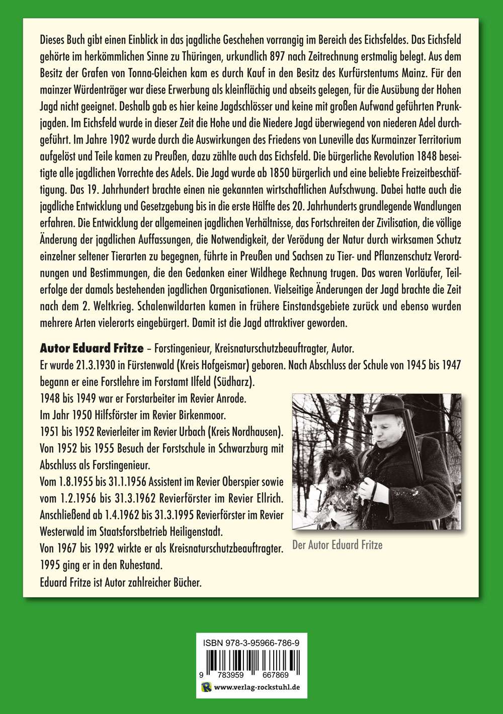 Eduard Fritze – Forstingenieur, Kreisnaturschutzbeauftragter, Autor. Er wurde 21.3.1930 in Fürstenwald (Kreis Hofgeismar) geboren. Nach Abschluss der Schule von 1945 bis 1947 begann er eine Forstlehre im Forstamt Ilfeld (Südharz). 1948 bis 1949 war er Forstarbeiter im Revier Anrode. Im Jahr 1950 Hilfsförster im Revier Birkenmoor. 1951 bis 1952 Revierleiter im Revier Urbach (Kreis Nordhausen). Von 1952 bis 1955 Besuch der Forstschule in Schwarzburg mit Abschluss als Forstingenieur. Vom 1.8.1955 bis 31.1.1956 Assistent im Revier Oberspier sowie vom 1.2.1956 bis 31.3.1962 Revierförster im Revier Ellrich. Anschließend ab 1.4.1962 bis 31.3.1995 Revierförster im Revier Westerwald im Staatsforstbetrieb Heiligenstadt. Von 1967 bis 1992 wirkte er als Kreisnaturschutzbeauftragter. 1995 ging er in den Ruhestand. Eduard Fritze ist Autor zahlreicher Bücher.