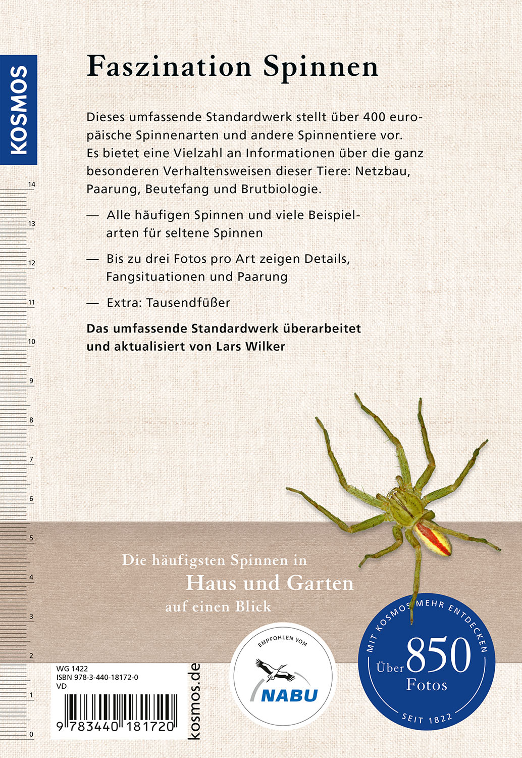 Der „Kosmos Spinnenführer“ stellt über 400 in Europa vorkommende Spinnenarten in mehreren Fotos und Detailzeichnungen vor. So lassen sich auch schwer zu erkennende Arten schnell und sicher bestimmen. Jede Art ist mit mehreren Fotos bebildert, Detailzeichnungen helfen bei der schnellen Zuordnung. Großartige Aufnahmen zeigen auch sehr seltene und gefährdete Spinnenarten. Unentbehrlich für Naturliebhaber, Spinnen-Fans und Terrarienfreunde.