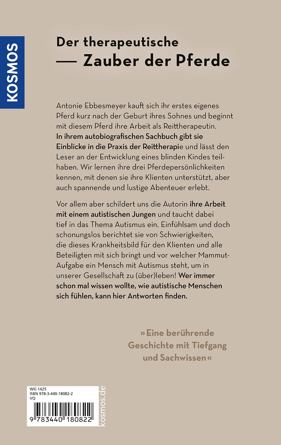 In ihrem autobiografischen Sach- und Lesebuch beschreibt Pferdetherapeutin Antonie Ebbesmeyer, wie sie ihr Familienleben, die Pferde und ihre Tätigkeit unter einen Hut bringt. Anhand eines berührenden Fallbeispieles zeigt sie, welche heilsame Wirkung Pferde auf autistische Menschen haben können, und erklärt so einfühlsam wie sachkundig, weshalb sich Pferde ganz besonders gut als Therapietiere eignen.