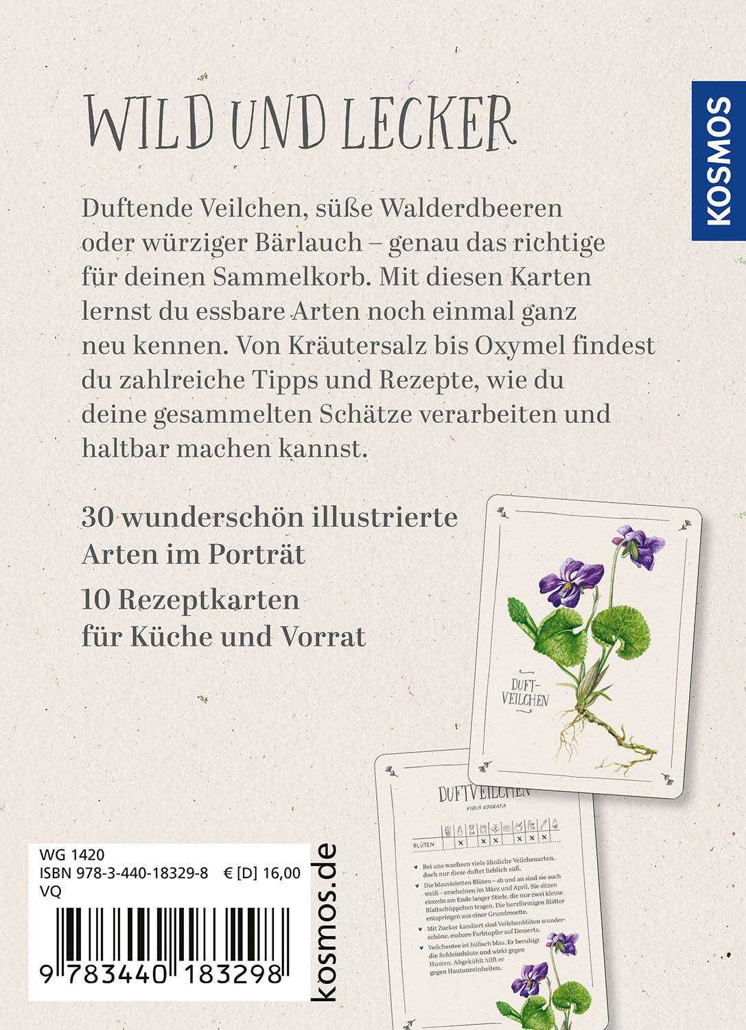 Auf 40 handlichen und wunderschön gestalteten Karten verbindet dieses einzigartige Set die Trend-Ästhetik Cottagecore mit dem einfachen Erkennen essbarer Pflanzen. Neben kurzen Artporträts und stimmungsvollen Illustrationen finden sich auf den Karten auch kreative Verwendungstipps und Rezepte.