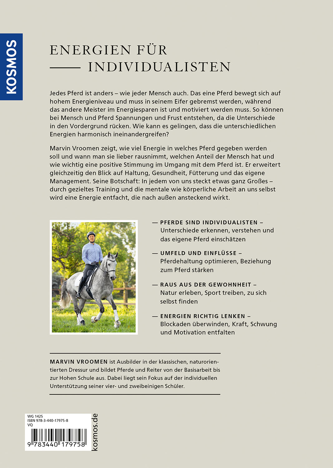 Phlegmatisch, rassig, abenteuerlustig oder harmoniesuchend – wie wir Menschen besitzen auch Pferde ganz unterschiedliche Charaktereigenschaften. In seinem Buch führt Pferdeausbilder Marvin Vroomen diese auf den einzigartigen Ansatz der Energieniveaus von Lebewesen zurück. Davon ausgehend zeigt er, wie Pferdehalter ihre eigenen Energiepotenziale sowie die ihrer Pferde entdecken können und gibt Anleitungen dafür, wie diese gelenkt werden können, um für mehr Motivation und Leistungsbereitschaft zu sorgen.