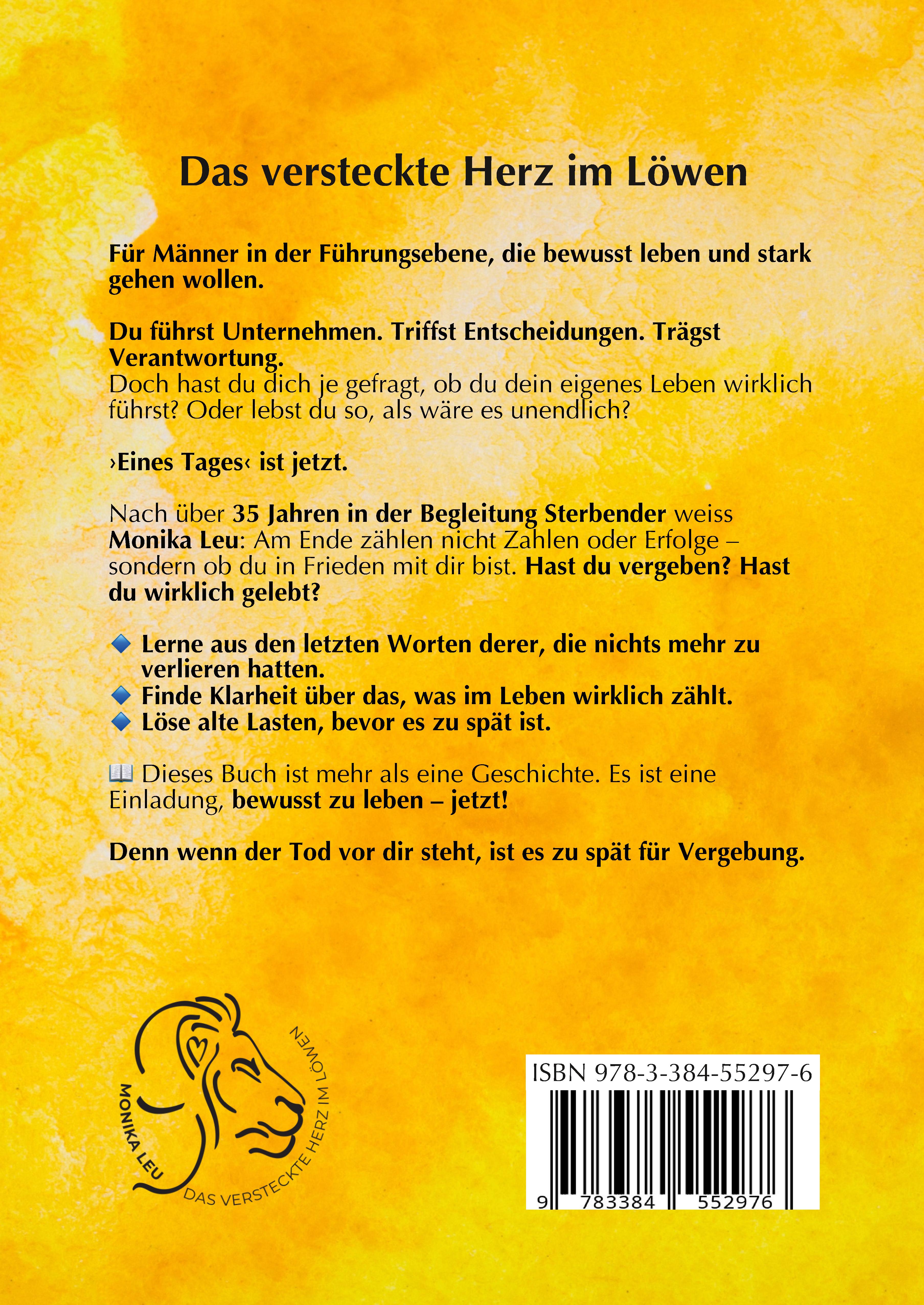 Für Männer in der Führungsebene, die bewusst leben und stark gehen wollen.Du führst Unternehmen. Triffst Entscheidungen. Trägst Verantwortung. Doch hast du dich je gefragt, ob du dein eigenes Leben wirklich führst? Oder lebst du so, als wäre es unendlich?"Eines Tages" ist jetzt.Nach über 35 Jahren in der Begleitung Sterbender weiß Monika Leu: Am Ende zählen nicht Zahlen oder Erfolge - sondern ob du in Frieden mit dir bist. Hast du vergeben? Hast du wirklich gelebt? Lerne aus den letzten Worten derer, die nichts mehr zu verlieren hatten. Finde Klarheit über das, was im Leben wirklich zählt. Löse alte Lasten, bevor es zu spät ist. Dieses Buch ist mehr als eine Geschichte. Es ist eine Einladung, bewusst zu leben - jetzt!Denn wenn der Tod vor dir steht, ist es zu spät für Vergebung.