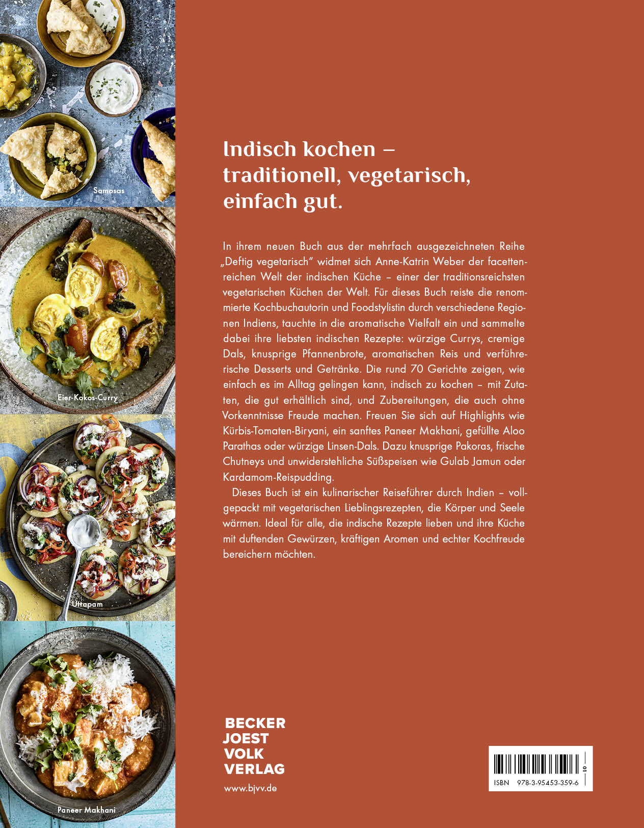 In ihrem neuen Buch aus der mehrfach ausgezeichneten Reihe Deftig vegetarisch widmet sich Anne-Katrin Weber der facettenreichen Welt der indischen Küche einer der traditionsreichsten vegetarischen Küchen der Welt. Für dieses Buch reiste die renommierte Kochbuchautorin und Foodstylistin durch verschiedene Regionen Indiens, tauchte in die aromatische Vielfalt ein und sammelte dabei ihre liebsten indischen Rezepte: würzige Currys, cremige Dals, knusprige Pfannenbrote, aromatischen Reis und verführerische Desserts und Getränke. Die rund 70 Gerichte zeigen, wie einfach es im Alltag gelingen kann, indisch zu kochen mit Zutaten, die gut erhältlich sind, und Zubereitungen, die auch ohne Vorkenntnisse Freude machen. Freuen Sie sich auf Highlights wie Kürbis-Tomaten-Biryani, ein sanftes Paneer Makhani, gefüllte Aloo Parathas oder würzige Linsen-Dals. Dazu knusprige Pakoras, frische Chutneys und unwiderstehliche Süßspeisen wie Gulab Jamun oder Kardamom-Reispudding.