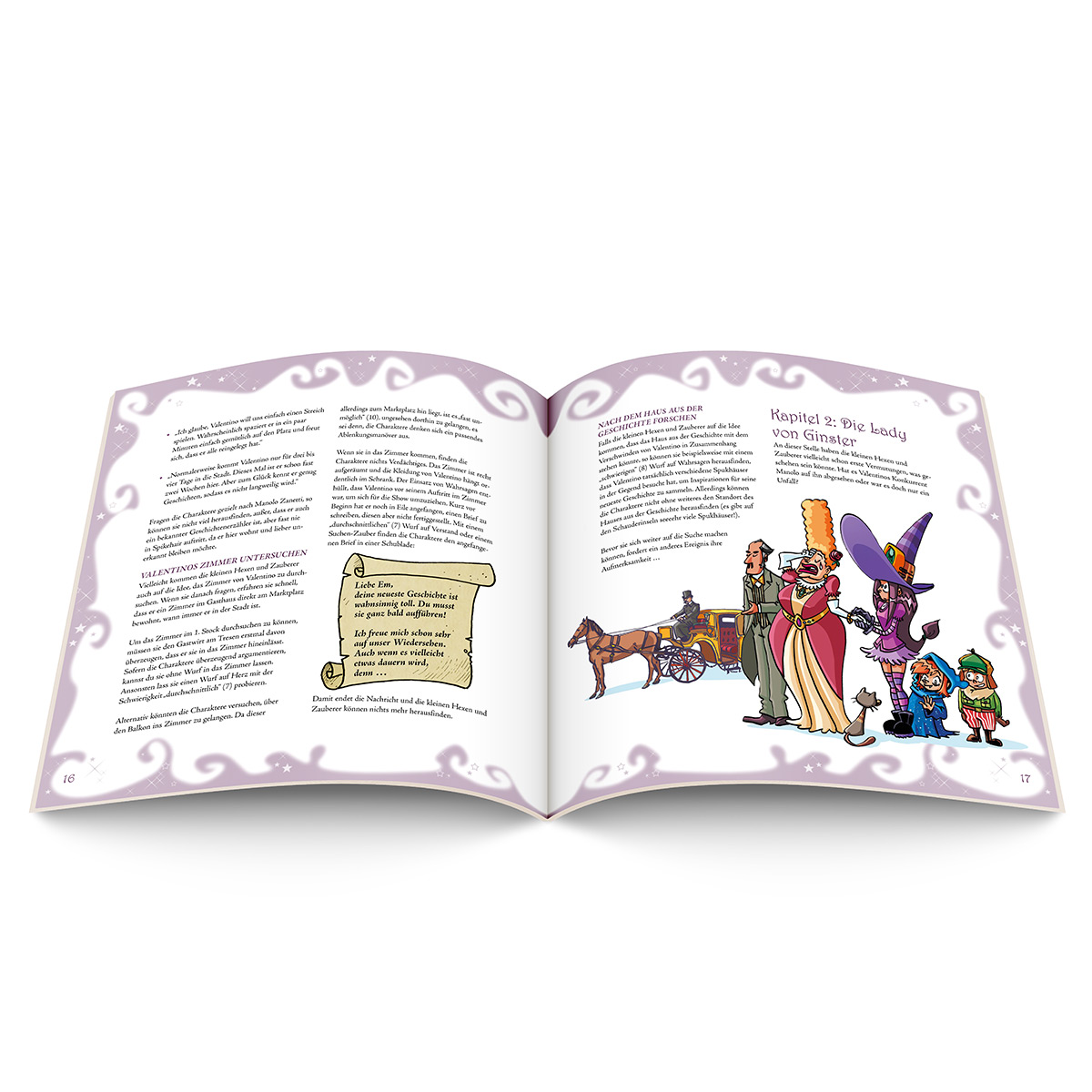 Die Ermittlungen führen die kleinen Hexen und Zauberer zur Villa der Lady von Ginster, zur berühmten Bibliothek von Spikehair und zu einem verlassenen Anwesen mitten im Gespenstischen Wald.