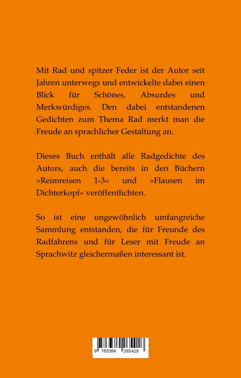 Zumeist komische Gedichte zum Thema Rad, zu Radtouren, zu Radfahrern und zu teilweise merkwürdigen Schildern. Viele Gedichte sind passend zu Fotographien gestaltet. Gereimte Rätsel zum Thema Rad sind ebenso zu finden, wie gedichte Geschichten über Radler.