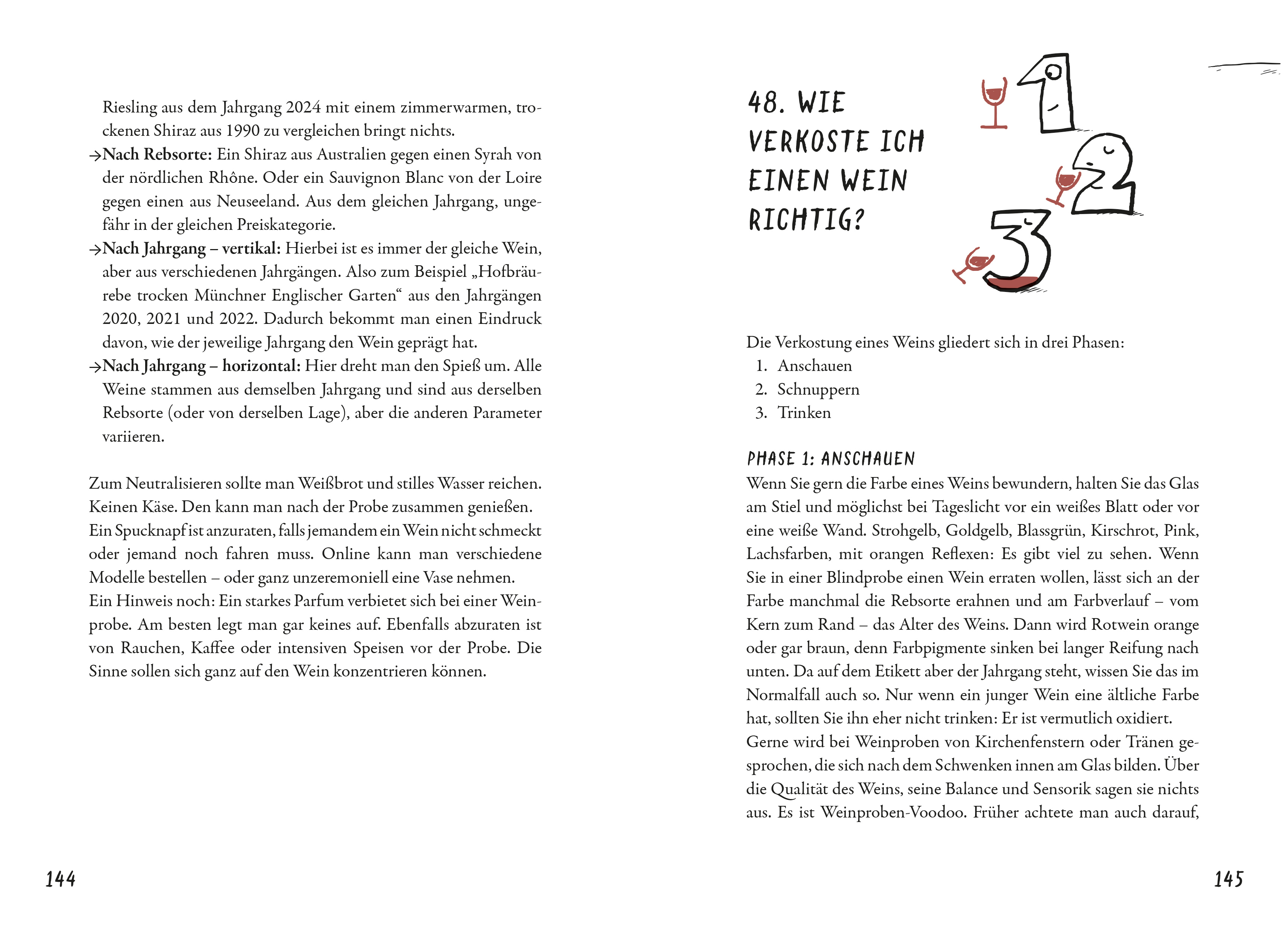 Sie wollen bei der nächsten Dinnerparty mit Freunden oder beim nächsten Restaurantbesuch alle mit Ihrem neu erworbenen Weinwissen beeindrucken? Kurzweiliger und genussvoller können Sie nicht zum Weinkenner werden. Maische, Tannine, Gerbstoffe, Oxidation, Mäuseln, Brett u.v.m - alles, was man über Wein wissen muss, wird mit viel Witz und Scharfsinn erklärt. Von Rebsorten und Weinbereitung über die Lagerung bis hin zum richtigen Trinken, das Buch ist eine kurzweilige Lektüre und ein handlicher Guide, der sowohl bei der Weinauswahl in der Weinhandlung und im Supermarkt hilft wie bei der Weinbestellung im Restaurant oder einer Weinverkostung. Die charmanten Illustrationen von Leo Leowald machen das Buch auch optisch zum Genuss.