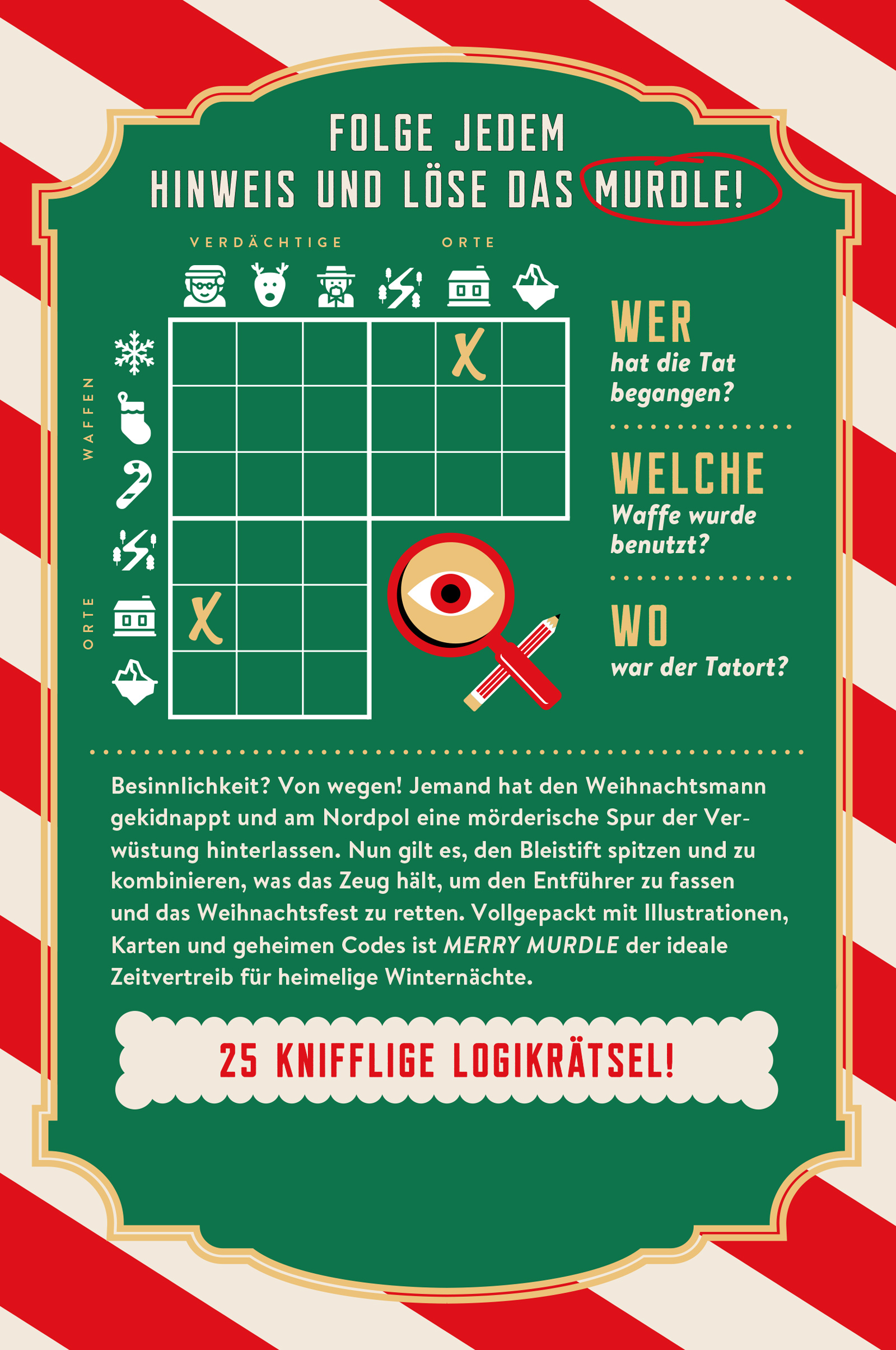 Kaum hat sich Deduktiv Logico auf eine besinnliche Adventszeit eingestellt, liegt auch schon die erste Leiche unterm Weihnachtsbaum – und er braucht Hilfe beim Ermitteln. 25 humorvolle Logikrätsel mit Krimitwist wecken den heimlichen Spürhund in dir und sorgen für mörderisch gute Festtagsstimmung. Vollgepackt mit Illustrationen, Karten und geheimen Codes, ist »Merry Murdle« der ideale Zeitvertreib. Spannungsreiche Winternächte garantiert!