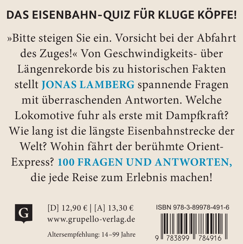 "Bitte steigen Sie ein. Vorsicht bei der Abfahrt des Zuges!" Ein kurzer Pfiff und los geht die Fahrt auf zwei Schienen: Von Geschwindigkeits- und Längenrekorden bis hin zu historischen Fakten stellt Jonas Lamberg spannende Fragen mit überraschenden Antworten. Welche Lokomotive fuhr als erste mit Dampfkraft? Wie lang ist die längste Eisenbahnstrecke der Welt? In welche Stadt fährt der berühmte Orient-Express? Spielerisch die Eisenbahn entdecken und das eigene Wissen erweitern!Stilvoll, elegant und immer eine gute Idee: Die Reihe "Quiz im Quadrat" präsentiert sich in modernem Design und sorgt für unterhaltsamen Rätselspaß - verpackt in einer edlen Geschenkbox. Perfekt als besondere 'Grußkarte' mit Mehrwert - zum Verschenken oder Selberfreuen!