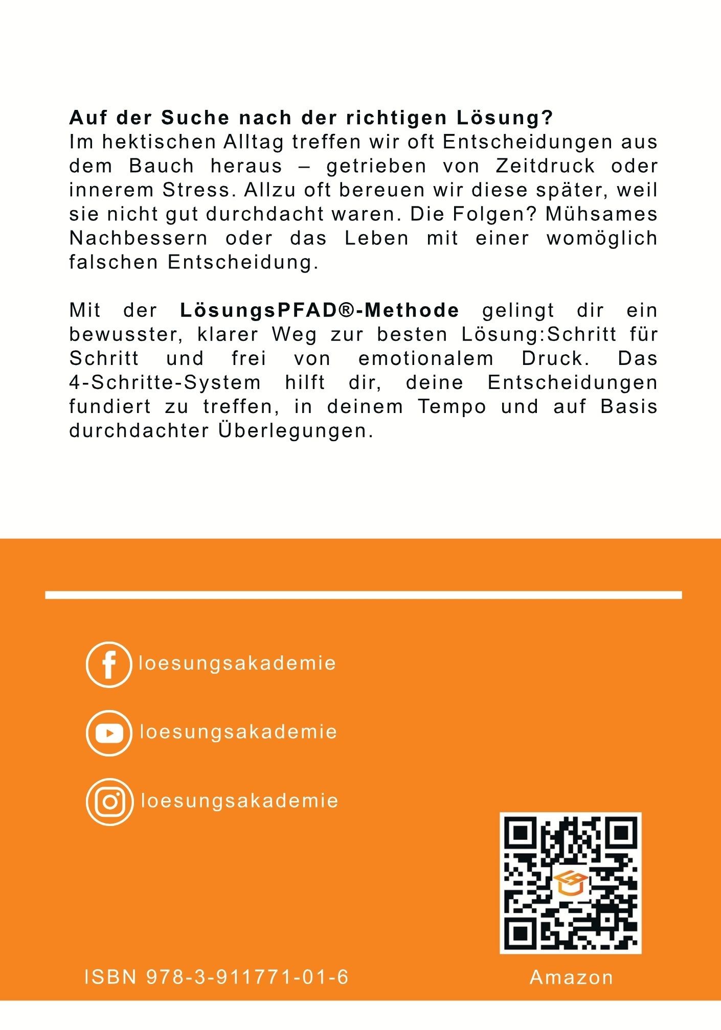 Im hektischen Alltag treffen wir oft Entscheidungen aus dem Bauch heraus – getrieben von Zeitdruck oder innerem Stress. Allzu oft bereuen wir diese später, weil sie nicht gut durchdacht waren. Die Folgen? Mühsames Nachbessern oder das Leben mit einer womöglich falschen Entscheidung. Mit der LösungsPFAD®-Methode gelingt dir ein bewusster, klarer Weg zur besten Lösung – Schritt für Schritt und frei von emotionalem Druck. Das 4-Schritte-System hilft dir, deine Entscheidungen fundiert zu treffen, in deinem Tempo und auf Basis durchdachter Überlegungen. Lerne, wie du mit Struktur und Methode nicht nur Ziele erreichst, sondern auch langfristige Zufriedenheit und Selbstbewusstsein aufbaust. Die LösungsPFAD®-Methode ist dein Schlüssel zu nachhaltigen Entscheidungen, die dich glücklicher und sicherer machen. Starte jetzt und entdecke den Weg zu deiner persönlichen Lebenszufriedenheit!
