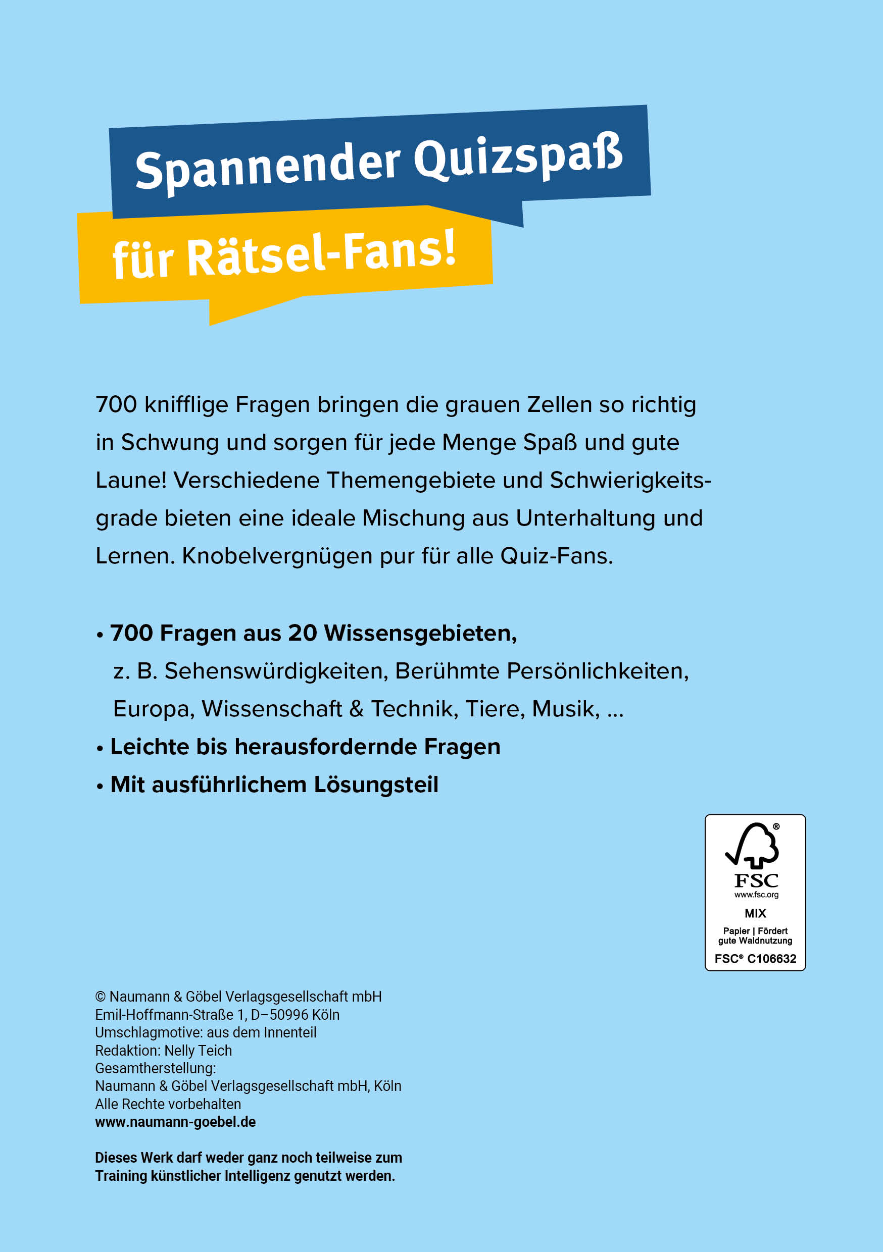 | Schlagworte | Allgemeinwissen • Buch • Bücher • Quiz • Quizbuch • Quizbücher • Quizfragen • Rätselbuch • Rätselbücher • Rätselquiz • Spiel • Spiele • Spieleabend • Wissensquiz |