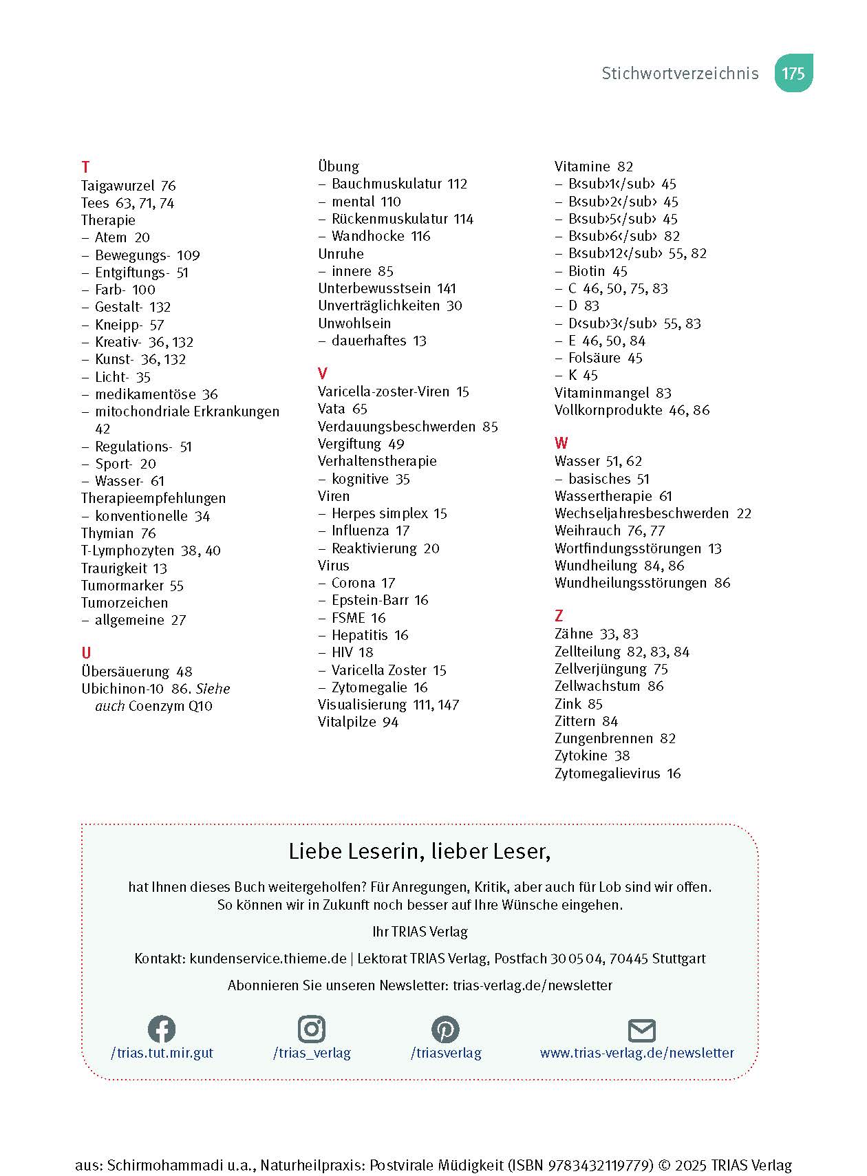 | Schlagworte | Akupressur • Akupunktur • Aromatherapie • Atemtherapie • Ätherische Öle • Ayurveda • Bachblüten • Entgiftung • Entspannung • Ernährung • fatigue • Fatigue Syndrom • Heilkräuter • Homöopathie • Hydrotherapie • Immunsystem • Immunsystem stärken • Kräuter • Meditation • Mikronährstoffe • Mineralstoffe • Müdigkeit • Nahrungsergänzungsmittel • Phytotherapie • Postvirales Erschöpfungssyndrom • Progressive Muskelentspannung • Schüssler Salze • Vitamine |