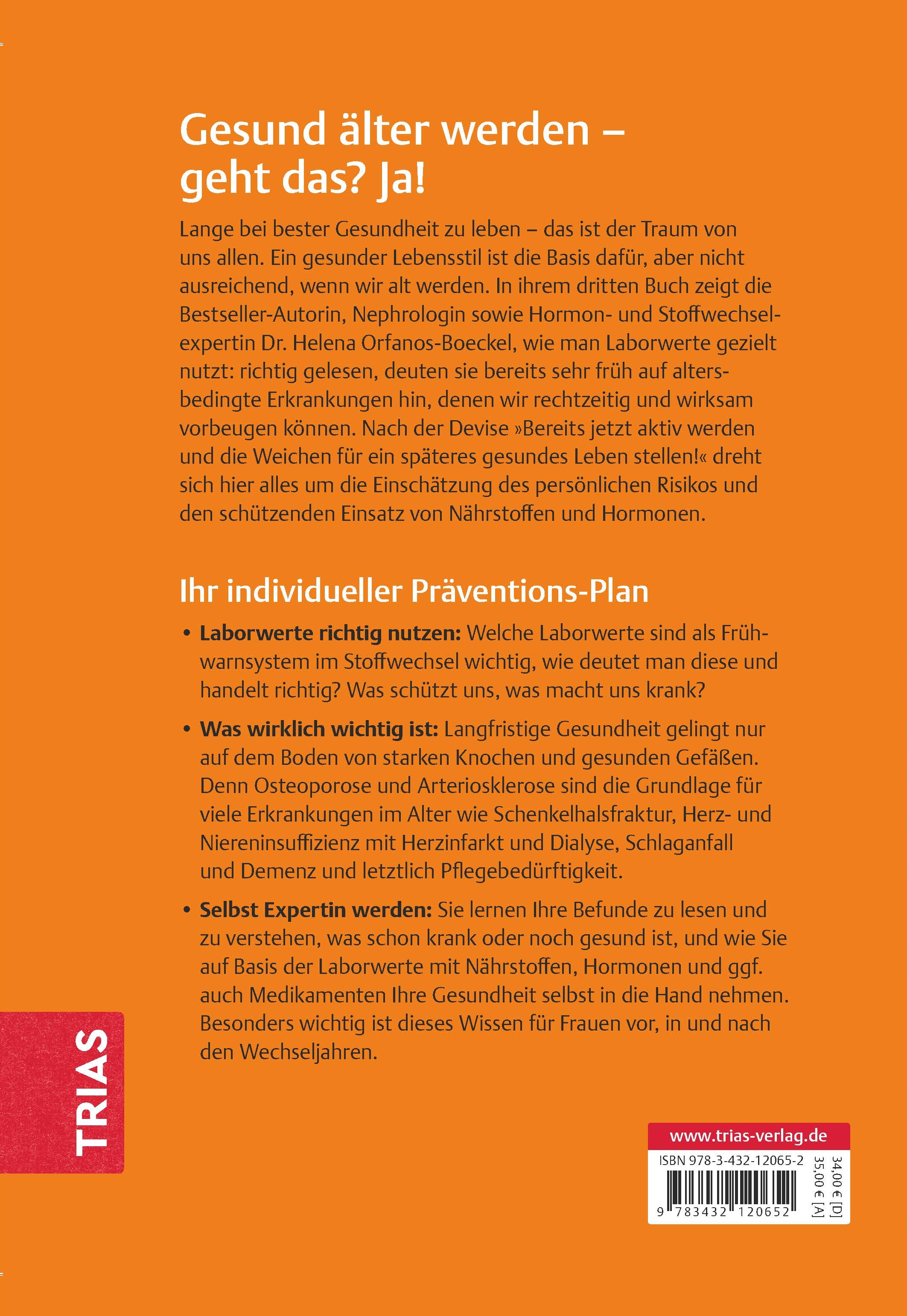 Lange bei bester Gesundheit zu leben – das ist der Traum von uns allen. Ein gesunder Lebensstil ist die Basis dafür, aber nicht ausreichend, wenn wir alt werden. In ihrem dritten Buch zeigt die Bestseller-Autorin, Nephrologin sowie Hormon- und Stoffwechselexpertin Dr. Helena Orfanos-Boeckel, wie man Laborwerte gezielt nutzt: richtig gelesen, deuten sie bereits sehr früh auf altersbedingte Erkrankungen hin, denen wir rechtzeitig und wirksam vorbeugen können. Nach der Devise „Bereits jetzt aktiv werden und die Weichen für ein späteres gesundes Leben stellen!“ dreht sich hier alles um die Einschätzung des persönlichen Risikos und den schützenden Einsatz von Nährstoffen und Hormonen.