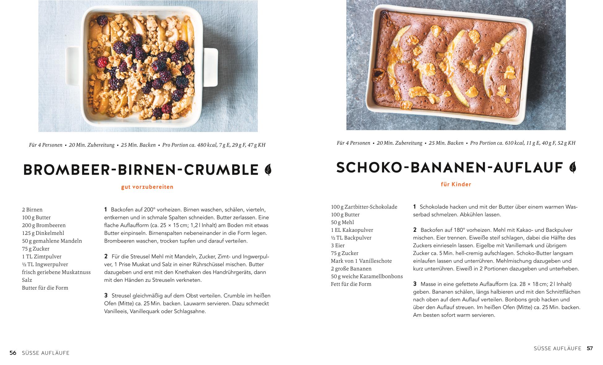 Im Rezeptteil finden Sie Rezepte für Aufläufe nach jedem Geschmack. Wie wäre es mit Gyrosauflauf oder einem Filo-Hackfleisch-Gratin? Oder möchten Sie lieber einnm vegetarischen Auflauf wie dem Zucchini-Auflauf alla Parmigiana oder dem Pilz-Auflauf mit Rösti-Kruste? Aber auch der süße Abschluss darf aus der Form kommen: Mit Brombeer-Birnen-Crumble und Kokos-Reisauflauf mit Mango ist für Schleckermäulchen gesorgt.