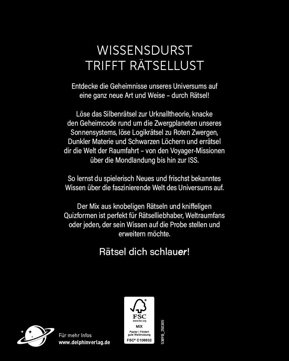 | Schlagworte | Astronaut • Astronomie • beschäftigung für senioren • Beschäftigung im Urlaub • Delphin • Denksport • Galaxie • Gehirnjogging • Geschenk Astronom • Geschenk Mann • Knobeln • Kosmonaut • Kosmos • Kreuzworträtsel • Planet • rätselbuch erwachsene • rätselbuch für rentner • Rätseln • Raumfahrt • Sonnensystem • Sterne • Sudoku • Weltall • Weltraum • Wissen |