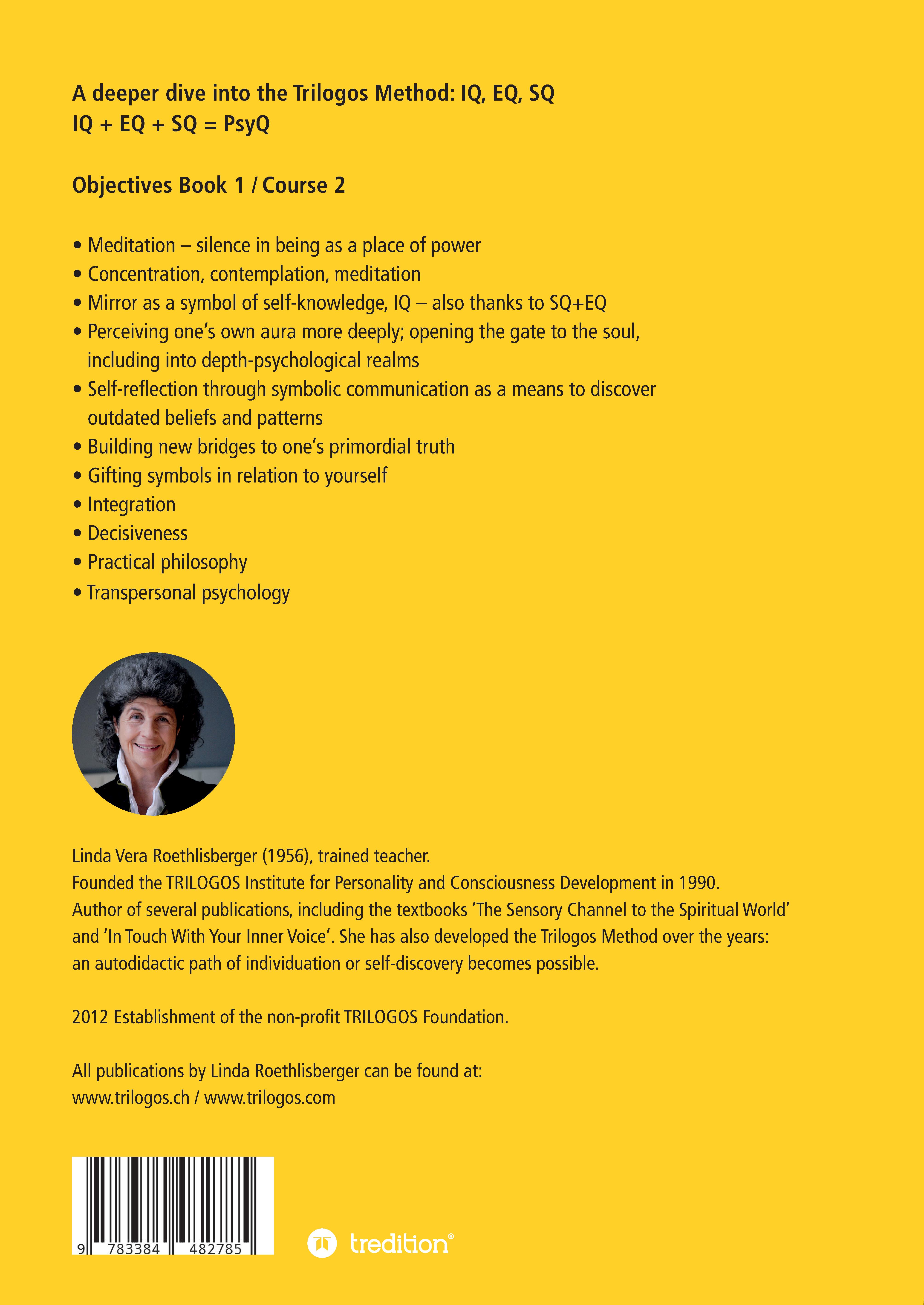 Linda Vera Roethlisberger (1956), ausgebildete Lehrerin Parallel dazu bildete sie in Bern und Paris ihr Talent als Künstlerin aus. Ihre eigenen medialen Anlagen bildete sie weiter als Schülerin von Silvia Wallimann, Prof. Dr. Milan Ryzl und Gordon Higginson und arbeitet seither u.a. auch als Medium. 1990 Gründung vom Institut TRILOGOS für Persönlichkeits- und Bewusstseinsschulung. Autorin mehrerer Publikationen, so u.a. der Lehrbücher »Der sinnliche Draht zur geistigen Welt« und »Im Kontakt mit der inneren Stimme«. Weiter entwickelte sie über die Jahre hinweg die TRILOGOS®Methode: ein autodidaktischer Individuations- oder Selbstfindungsweg wird möglich. 2012 Gründung der gemeinnützigen TRILOGOS Stiftung. _______________________________________________________________________________ Linda Vera Roethlisberger (1956), certified teacher At the same time, she developed her artistic talent in Bern and Paris. She developed and cultivated her own mediumistic capabilities as a student of Silvia Wallimann, Prof. Dr. Milan Ryzl and Gordon Higginson, and has since also been working as a medium. 1990 — Founding of TRILOGOS, an institute for personality and consciousness training. Author of numerous publications, among them the guidebooks The Sensory Channel to the Spiritual World (Der sinnliche Draht zur geistigen Welt) and In Touch With Your Inner Voice (Im Kontakt mit der inneren Stimme). Over the years, she has also developed the Trilogos Method, allowing for self-guided individuation or self-discovery. 2012 — Founding of the charitable Trilogos Foundation