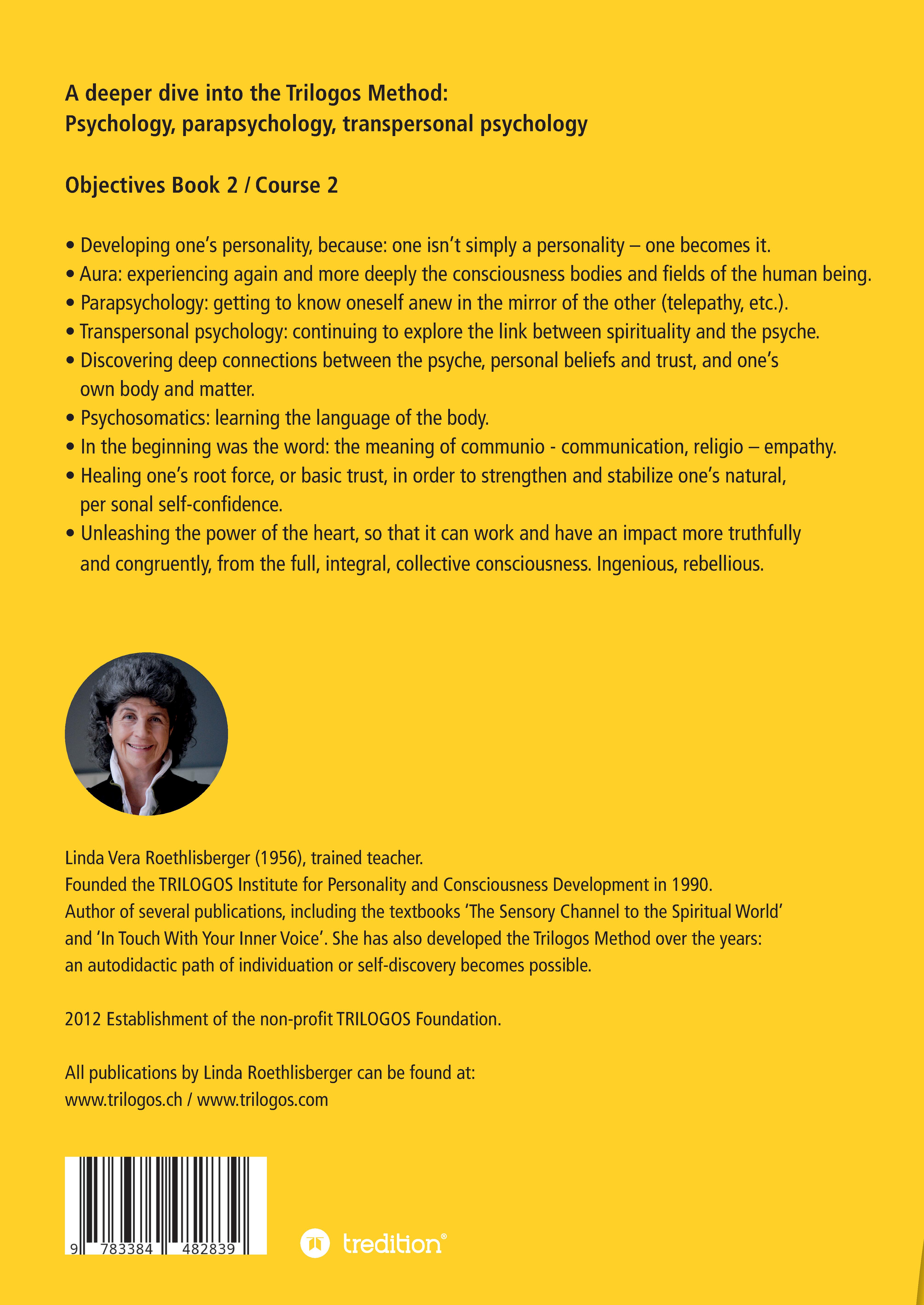 Linda Vera Roethlisberger (1956), ausgebildete Lehrerin Parallel dazu bildete sie in Bern und Paris ihr Talent als Künstlerin aus. Ihre eigenen medialen Anlagen bildete sie weiter als Schülerin von Silvia Wallimann, Prof. Dr. Milan Ryzl und Gordon Higginson und arbeitet seither u.a. auch als Medium. 1990 Gründung vom Institut TRILOGOS für Persönlichkeits- und Bewusstseinsschulung. Autorin mehrerer Publikationen, so u.a. der Lehrbücher »Der sinnliche Draht zur geistigen Welt« und »Im Kontakt mit der inneren Stimme«. Weiter entwickelte sie über die Jahre hinweg die TRILOGOS®Methode: ein autodidaktischer Individuations- oder Selbstfindungsweg wird möglich. 2012 Gründung der gemeinnützigen TRILOGOS Stiftung. _______________________________________________________________________________ Linda Vera Roethlisberger (1956), certified teacher At the same time, she developed her artistic talent in Bern and Paris. She developed and cultivated her own mediumistic capabilities as a student of Silvia Wallimann, Prof. Dr. Milan Ryzl and Gordon Higginson, and has since also been working as a medium. 1990 — Founding of TRILOGOS, an institute for personality and consciousness training. Author of numerous publications, among them the guidebooks The Sensory Channel to the Spiritual World (Der sinnliche Draht zur geistigen Welt) and In Touch With Your Inner Voice (Im Kontakt mit der inneren Stimme). Over the years, she has also developed the Trilogos Method, allowing for self-guided individuation or self-discovery. 2012 — Founding of the charitable Trilogos Foundation