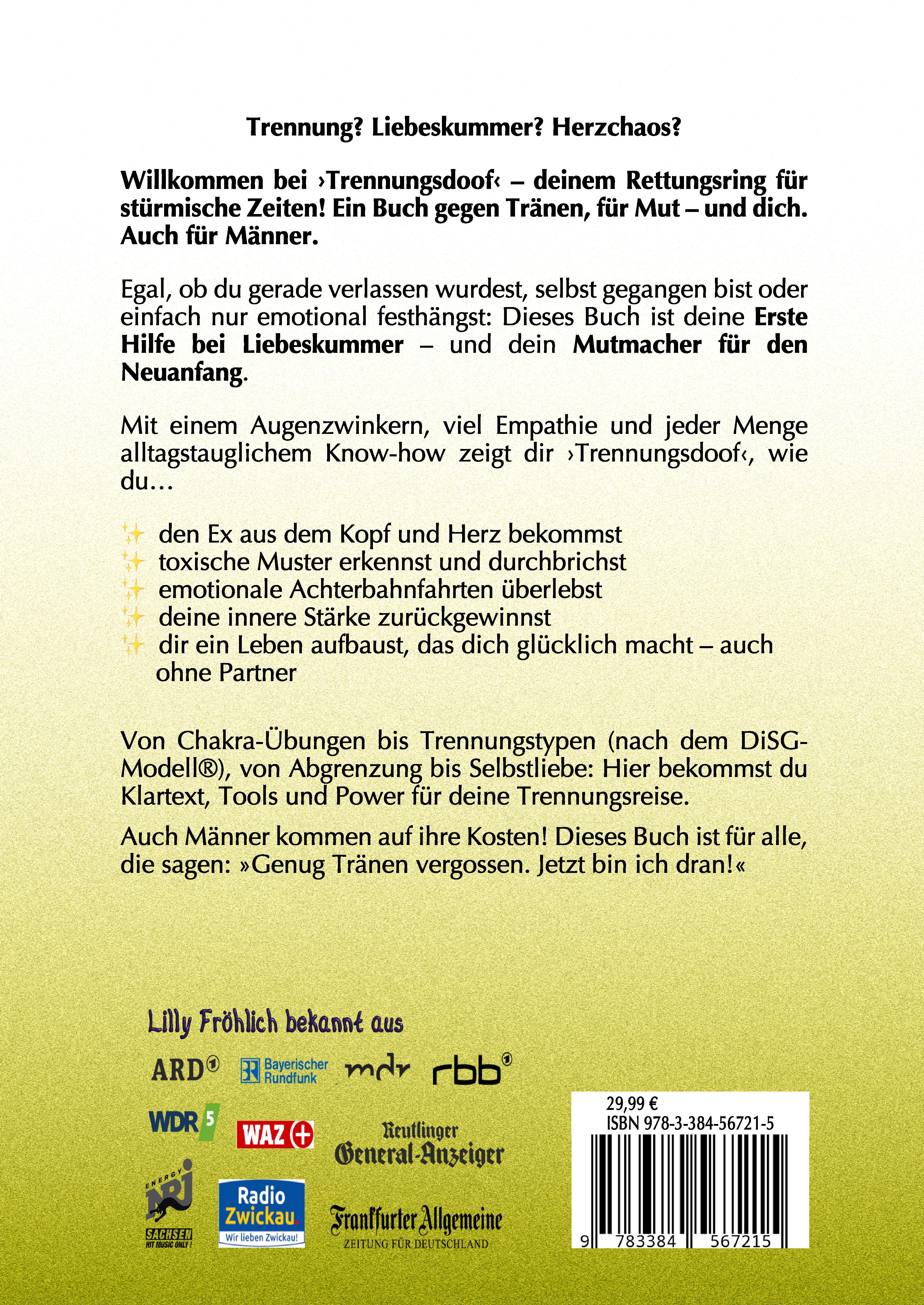 | Schlagworte | Abgrenzung • Abgrenzungsstrategien • Abschied • Beziehung • Chakra-Übungen • Chakren • Doofiversum • Drama • Ehe • Ehescheidung • emotionale abhängigkeit • Erste Hilfe • Ex-Partner • Frauen • Herzschmerz • Kinder • Liebe • Liebeskummer • Männer • Mut • Mutmachen • Narzissmus • Narzisst • Neuanfang • Neustart • Partner • Ratgeber • Red Flags • rettungsanker • Rettungsring • Selbstachtung • Selbstliebe • Selbstwertgefühl • Sofortmaßnahmen • toxische Beziehung • toxischer liebeskummer • toxischer partner • Tränen • Trennung • Trennungsdoof • Trennungsratgeber • Trennungsschmerz • wahrhaftige Liebe • Weinen |