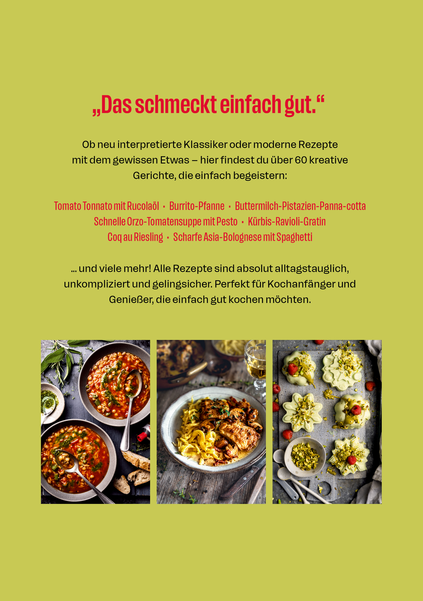 | Schlagworte | Alltagsküche einfach • einfache Rezepte • Foodlover • gelingsichere Rezepte • gesunde Genussrezepte • Hobbyköche Inspiration • Kochbuch kreativ • Kochen für Anfänger • Kochen mit Liebe • kreative Küche • LECKERE REZEPTIDEEN • Moderne Klassiker • Saisonale Küche |