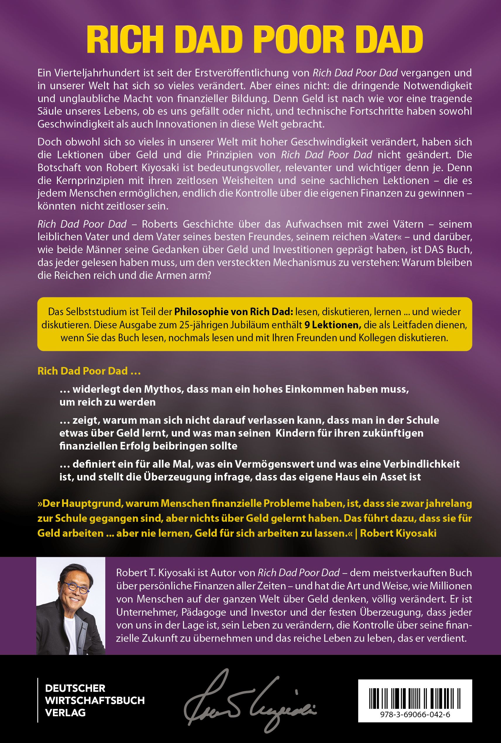 Doch obwohl sich so vieles in unserer Welt mit hoher Geschwindigkeit verändert, haben sich die Lektionen über Geld und die Prinzipien von Rich Dad Poor Dad nicht geändert. Die Botschaft von Robert Kiyosaki ist bedeutungsvoller, relevanter und wichtiger denn je. Denn die Kernprinzipien mit ihren zeitlosen Weisheiten und seine sachlichen Lektionen - die es jedem Menschen ermöglichen, endlich die Kontrolle über die eigenen Finanzen zu gewinnen - könnten nicht zeitloser sein.