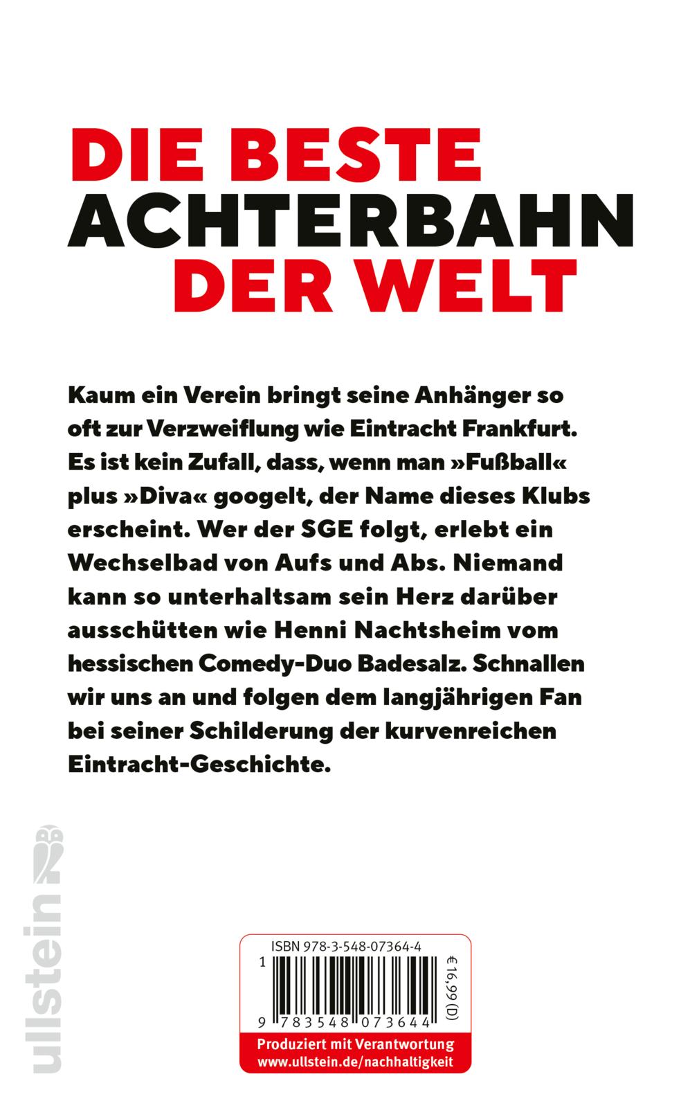Vermutlich bringt kaum ein Bundesligaverein seine Anhänger so oft an den Rand des Nervenzusammenbruchs wie Eintracht Frankfurt. Und so ist es kein Zufall, dass, wenn man "Sport" und "Diva" zusammen googelt, der Name dieses Klubs erscheint. Wer der SGE folgt, erlebt ein dauerndes Wechselbad von Aufs und Abs. Einem Sieg beim FC Barcelona kann ohne Weiteres eine Pleite beim Rheinhessen-Derby gegen Mainz 05 folgen. Niemand kann so ausgiebig und so unterhaltsam sein Herz über die Eintracht ausschütten wie Henni Nachtsheim, die eine Hälfte des hessischen Comedy-Duos Badesalz. Schnallen wir uns also an und folgen wir dem langjährigen Fan bei seiner Schilderung der kurvenreichen Eintracht-Geschichte - bis in die jüngste Gegenwart.
