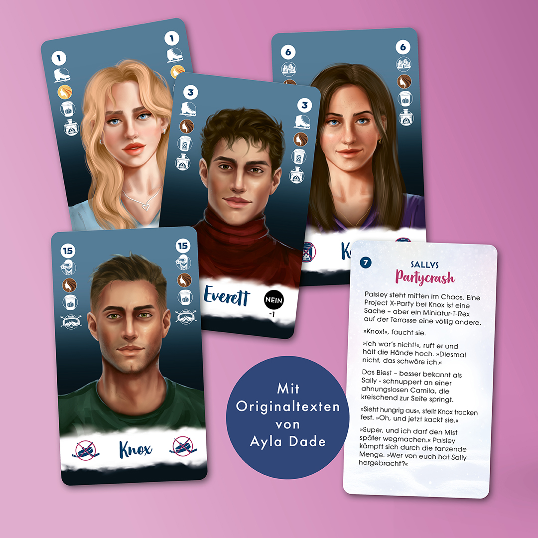 Taucht ein in die Welt der Winter Dreams-Reihe von New-Adult-Star Ayla Dade und findet die gesuchte Person! Runde für Runde gebt ihr Zeugenaussagen über ihre Eigenschaften ab, stellt die Aussagen der anderen infrage und sammelt wertvolle Hinweise. Doch Vorsicht - nicht jede Aussage ist glaubwürdig! Wer am Ende die richtige Person auf der Hand hält, gewinnt das Spiel.