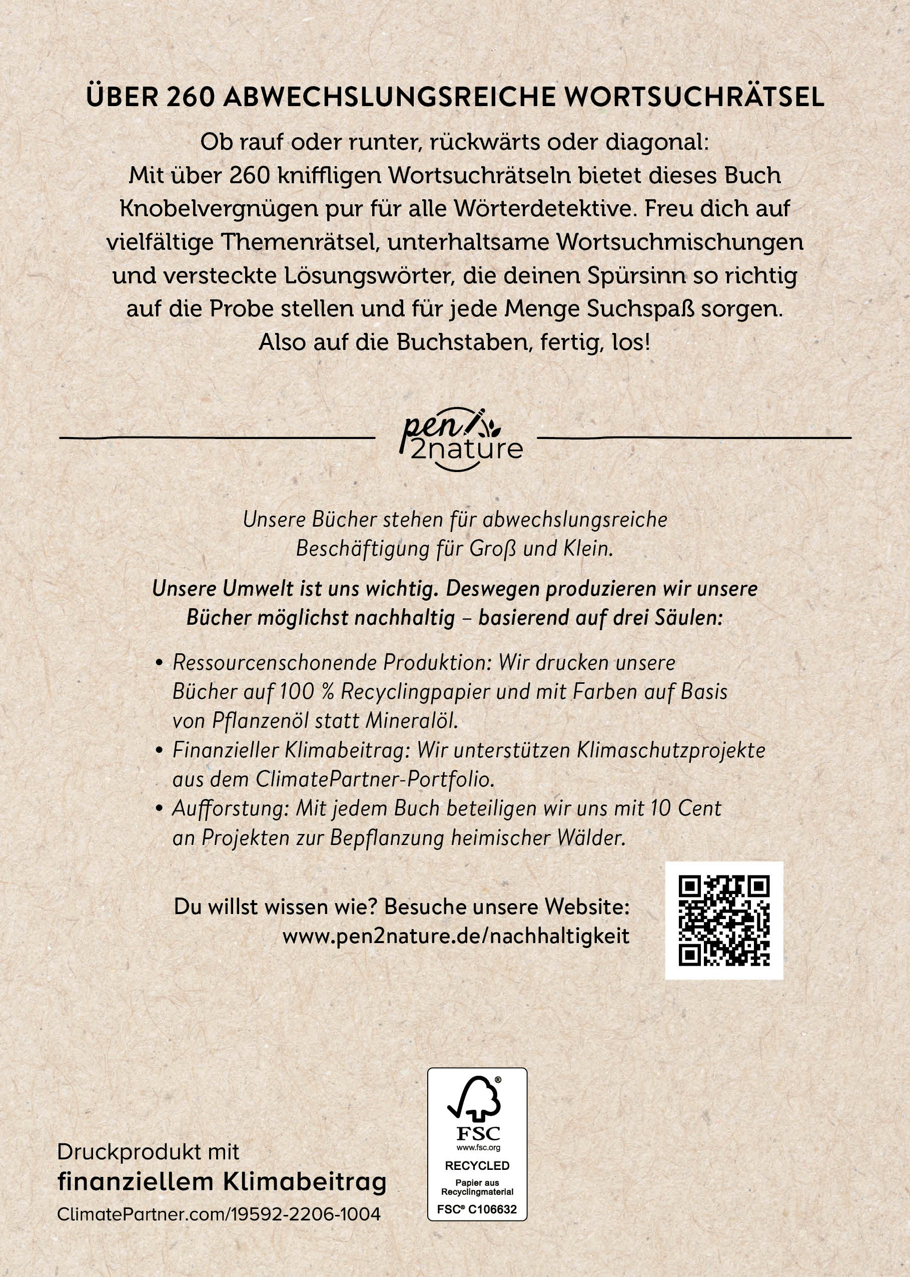 | Schlagworte | Buch • Buchstabengitter • Buchstabensalat • Denkspiele • Denksport • Gedächtnistraining • Gehirnjogging • klimaneutral • Klimawandel • Knobeln • Kopftraining • Nachhaltigkeit • pen2nature • pen to nature • Pflanzenfarben • Raten • Rätsel • Rätselbuch • Rätseln • Rätselspaß • Recycling • Recyclingpapier • Umweltschutz • wörtersuchen • Wörter suchen • Wortgitter • Wortschatz • wortsuche • Wortsuchgitter • Wortsuchrätsel • Wortsuchspiel |