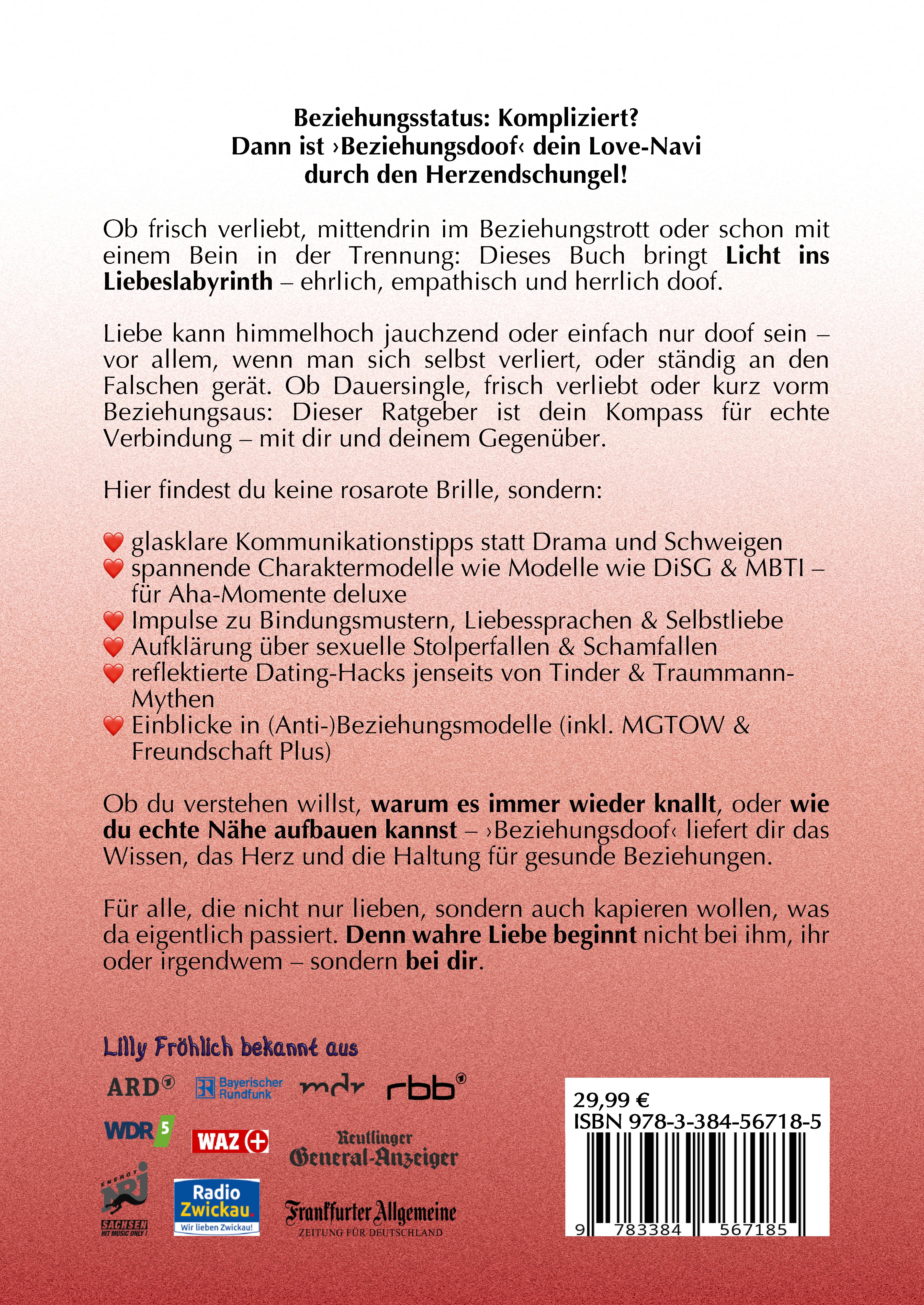 Die in Hamburg geborene und aufgewachsene Juristin, Autorin, Journalistin, Podcasterin und Ghostwriterin "Lilly Fröhlich" lebt mit ihrer Familie in Sachsen. Sie hat sich auf die Verbindung von juristischen Themen mit einer Prise Humor spezialisiert und ist bekannt für ihre Reihe der "doofen Bücher", die lebendige Aufklärung bieten. Neben ihren Ratgebern hat sie auch Arbeitsbücher veröffentlicht, die als praktische Begleiter dienen und den Lesern helfen, das Gelernte direkt umzusetzen. Ihre Ratgeber sind bildhaft und mit vielen Beispielen aus dem Leben verknüpft, sie sind problemlösend und lösungsorientiert. Die "doofen Bücher" gelten als Problemlöser für ein glücklicheres Leben und haben bereits Tausende Leserinnen und Leser begeistert. Bekannt aus Funk und Fernsehen ARD Live nach Neun „Ob Eltern, Partner oder Kinder: Das Thema Pflege geht früher oder später fast jeden an. Dann stellen sich Fragen wie: Wo kann ich welche Hilfen beantragen? Journalistin Lilly Fröhlich hat (mit Pflegedoof) ein Buch dazu geschrieben und verrät uns wichtige Tipps.“ rbb schön + gut „Finanzielle Hilfen für pflegende Angehörige – Welche finanziellen Entlastungen es gibt und wie wir sie beantragen, sagt Juristin und Ratgeberautorin Lilly Fröhlich.“ MDR um 2, MDR um 4, MDR um 11 „Ganz gleich, welche Wohnform der flügge gewordene Nachwuchs wählt, der Auszug aus dem "Hotel Mama" ist spannend und aufregend. Expertin Nicole Schwalbe gibt Tipps zu den ersten Schritten ins eigene Zuhause, zu Kosten und Nebenkosten sowie zu wichtigen Versicherungen.“