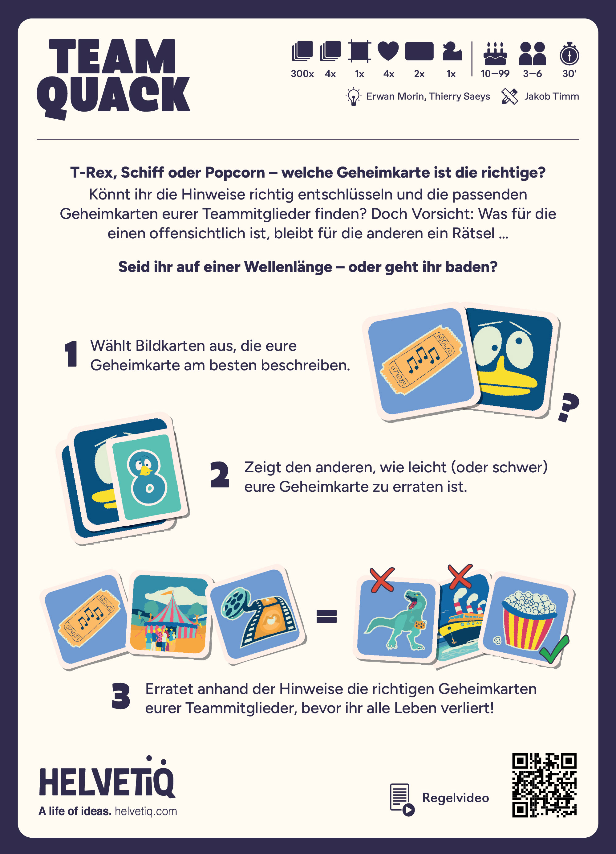 Team Quack ist ein kooperatives Spiel, bei dem scharfe Beobachtung und clevere Hinweise euch zum Erfolg führen! Arbeitet zusammen, entschlüsselt die Geheimkarten und gebt einander die richtigen Hinweise - ohne zu viel zu verraten. In jeder Runde müsst ihr einschätzen, wie offensichtlich eure Hinweise sind und wie leicht die anderen eure Geheimkarte erraten können. Aber Vorsicht: Zu viele falsche Rateversuche kosten euch wertvolle Leben! Zeigt, dass euer Team auf derselben Wellenlänge schwingt.So funktioniert es:1. Wählt Bildkarten aus, die eure Geheimkarte am besten beschreiben.2. Zeigt den anderen, wie leicht (oder schwer) eure Geheimkarte zu erraten sind.3. Ordnet die Geheimkarten den richtigen Personen zu - bevor ihr alle Leben verliert.Können die anderen eure Gedanken entschlüsseln? Quack together ist ein einfaches, spaßiges Assoziationsspiel, bei dem Bilder mehr sagen als Worte - ideal für die ganze Familie!