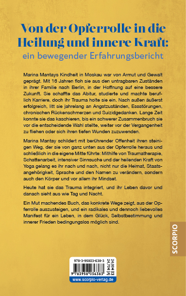 Von Geburt an schien Marina Mantays Schicksal vorbestimmt gewesen zu sein. Ihre Kindheit in Russland war von Armut und Gewalt geprägt, der Vater Alkoholiker, die Mutter psychisch gestört. Mit 16 Jahren floh sie allein nach Berlin, wollte frei sein, eine friedliche Zukunft haben. Doch mit 17 wurde sie abgeschoben, schaffte es aber ein Jahr später erneut zurück, machte Abitur, studierte und begann zu arbeiten. Dass sie die ganze Zeit an Angstzuständen, Essstörungen, chronischen Rückenschmerzen und Suizidgedanken litt, konnte sie gut überspielen. Bis sie zusammenbrach und erkannte, dass sie das Trauma ihrer Kindheit nie losgelassen hatte und es Zeit war, sich ihren Schatten und den tiefen Wunden in ihrer Seele zu stellen.